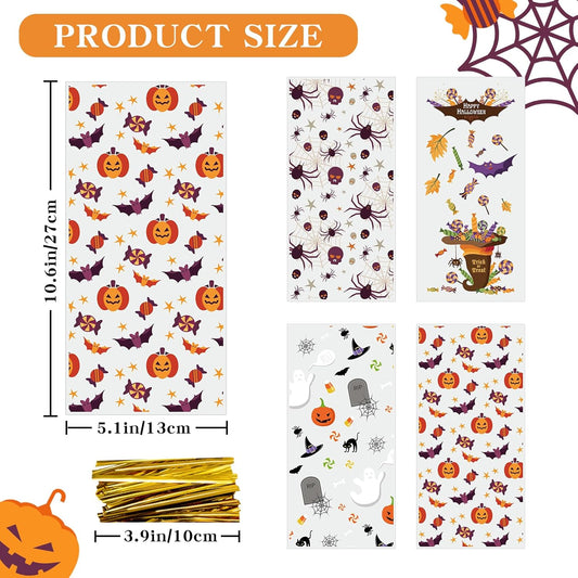 Halloween Cellophane Treat Bags, 180Pcs Halloween Trick or Treat Goody Gags with 200Pcs Twists for Snacks Cookies Packing, Halloween Goodie Bags Party Supplies
