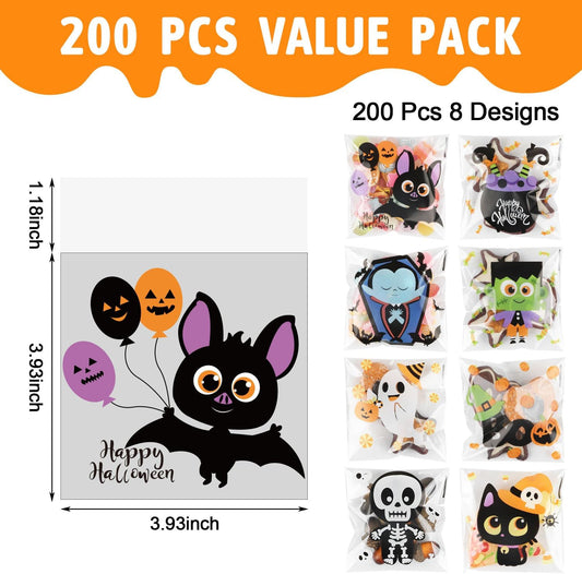 200Pcs Halloween Candy Bags,Self-Adhesive Cellophane Treat Bags 8 Styles Cute for Kids Gift Packing Party Favor Supplies