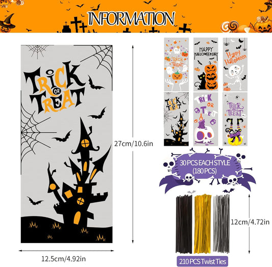 180 Pack Halloween Cellophane Treat Bags, Plastic Goodie Candy Bag for Kids Clear Goody Snack Bags Bulk Party Favors with 210 Twist Ties