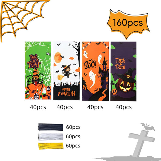 160PCS Halloween Cellophane Treat Bags, Plastic Goodie Candy Bag Goody Snack Sweet Bags with Twist Ties for Halloween Party Favor Supply(4 Style)