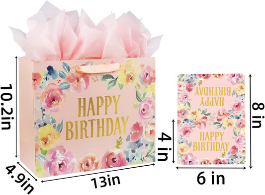 13" Large Happy Birthday Gift Bag with Card and Tissue Papers for Women Girls Floral Design with Handles