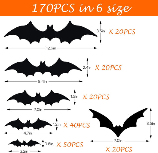 Bats Wall Decor, 170Pcs 3D Bat Halloween Decorations, Windows Stickers 6 Different Sizes PVC Black Bat Sticker for DIY Home Decor, Indoor Hallowmas Party Supplies