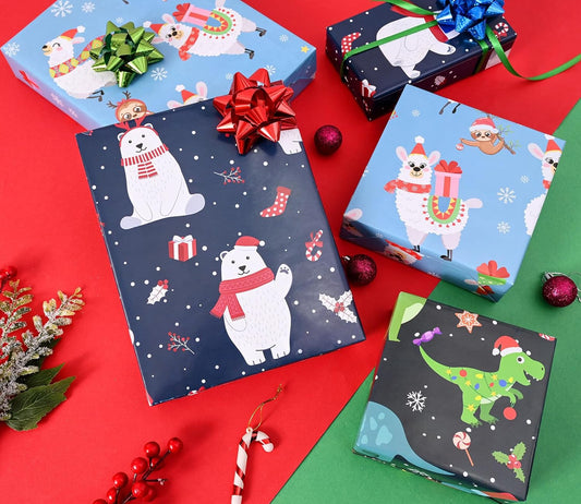 Christmas Wrapping Paper for Kids Boys Girls 6 Large Sheet Gift Wrapping Paper Xmas Holiday Gift Wrap Paper Christmas Decorations Pattern Dinosaur, Bear, Llama, Sloth Folded Flat 27 * 37Inch