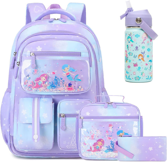 Kids School Backpack for Girls, Mermaids Bookbag Backpack with 14OZ Kids Water Bottle, Lunch Bag Set for Girls Kids Teens Middle School Student, Girls Backpack for School (4Pcs Water Bottle)