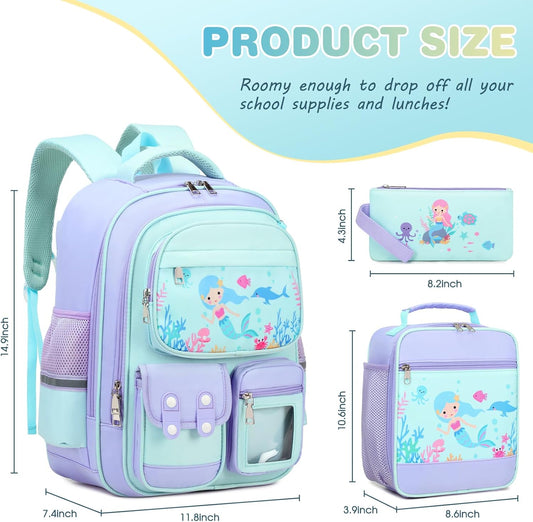 3PCS School Backpack for Girls, Kids Backpack for Girls with Lunch Box Pencil Case, Cute Kawaii Mermaid Backpack for Girls, Schoolbag Bookbag for Kindergarten Elementary Middle High School