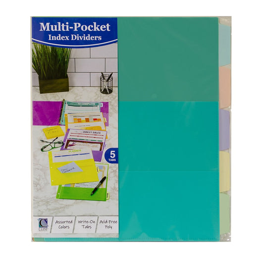 5-Tab Index Dividers with Multi-Pockets, Bright Color Assortment, 8-1/2 x 11