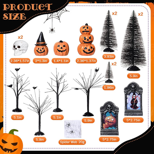 19 Pcs Halloween Village Accessories Set Miniature Halloween Figurines Houses Ornaments Bare Branches LED Tombstones Skeleton Pumpkin Statues Fake Spiders Halloween Party Decor