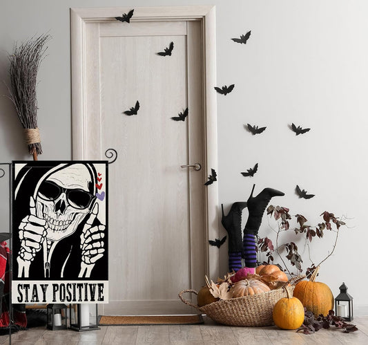 Halloween Garden Flags for outside Decoration, STAY POSITIVE Funny Skeleton Small Yard Flag for Outdoor Decor 12X18 Inch Vertical Double Sided