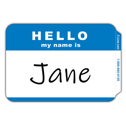 Pressure Sensitive Badges, Hello my name is, Blue, 3-1/2" x 2-1/4", Box of 100