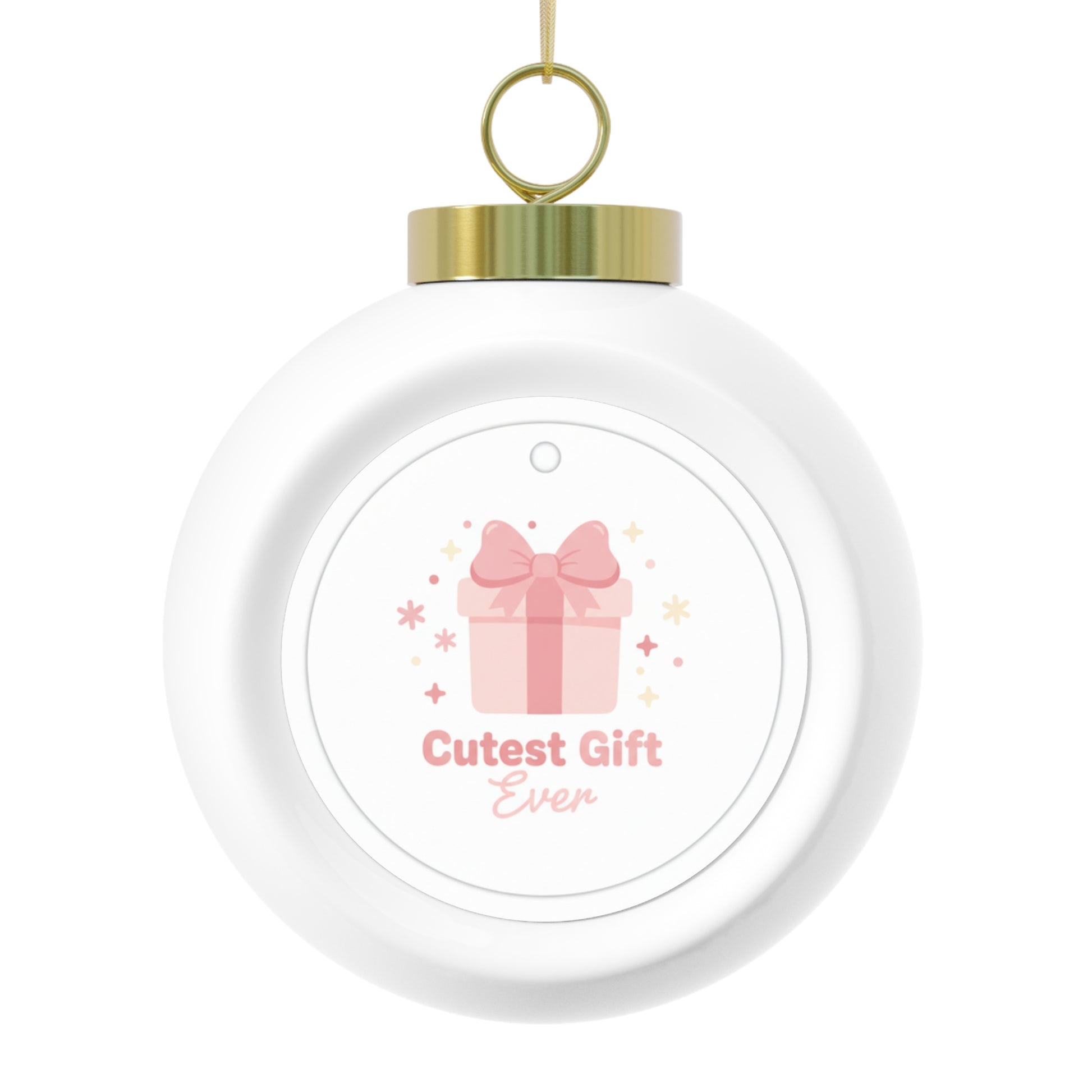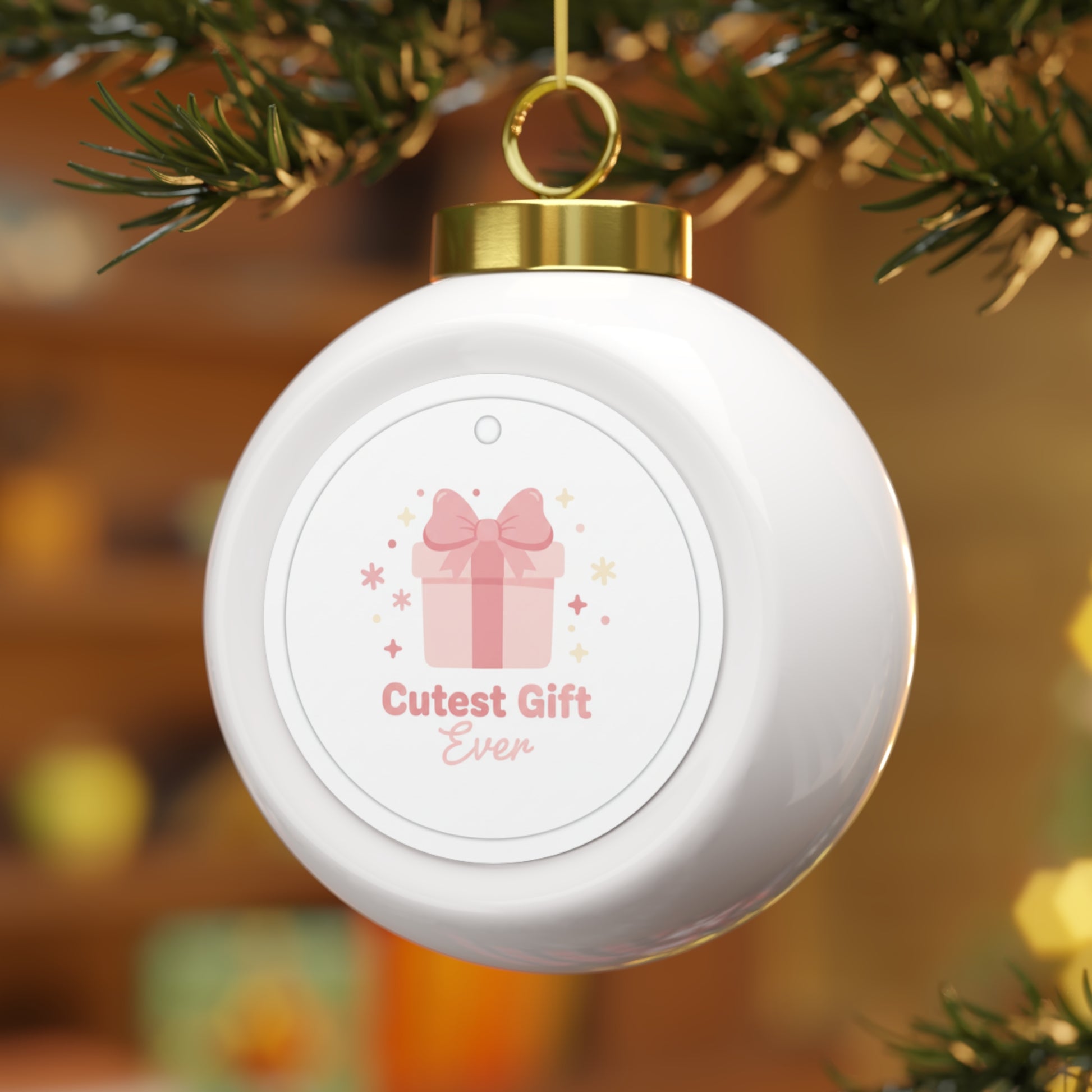 A glossy 3-inch ceramic ornament featuring playful "Cutest Gift Ever" lettering for a sweet holiday accent. Ready to hang with a gold ribbon, it makes a charming keepsake for new parents, grandparents, or gift exchanges. The vintage-style finish and decorative back detail add classic seasonal charm.