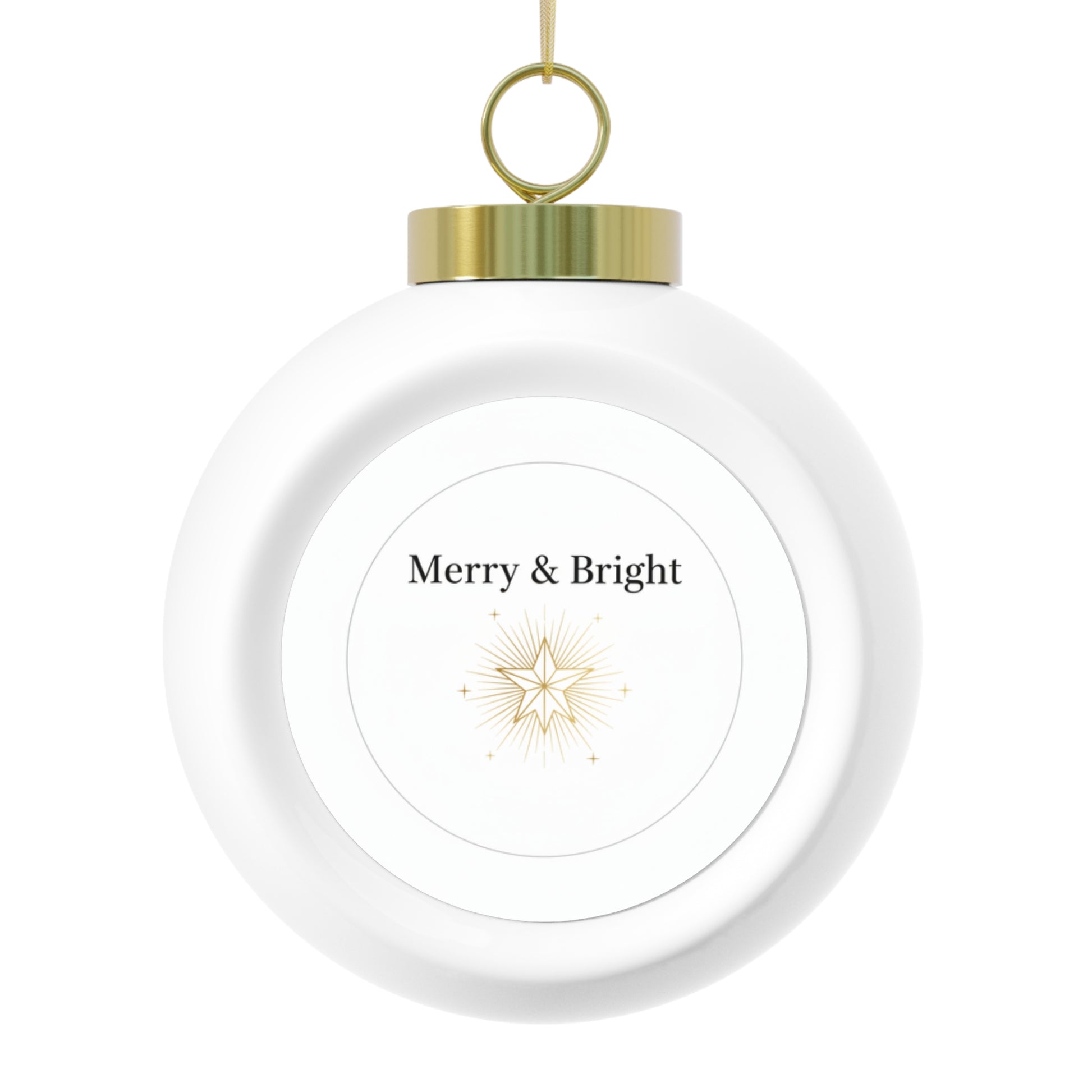 Classic 3-inch glossy ceramic Christmas ornament featuring the cheerful Merry & Bright lettering on a crisp aluminum insert. Includes a gold hanging ribbon and vintage-inspired styling for a timeless holiday look. Perfect for decorating your tree or gifting to friends and family.