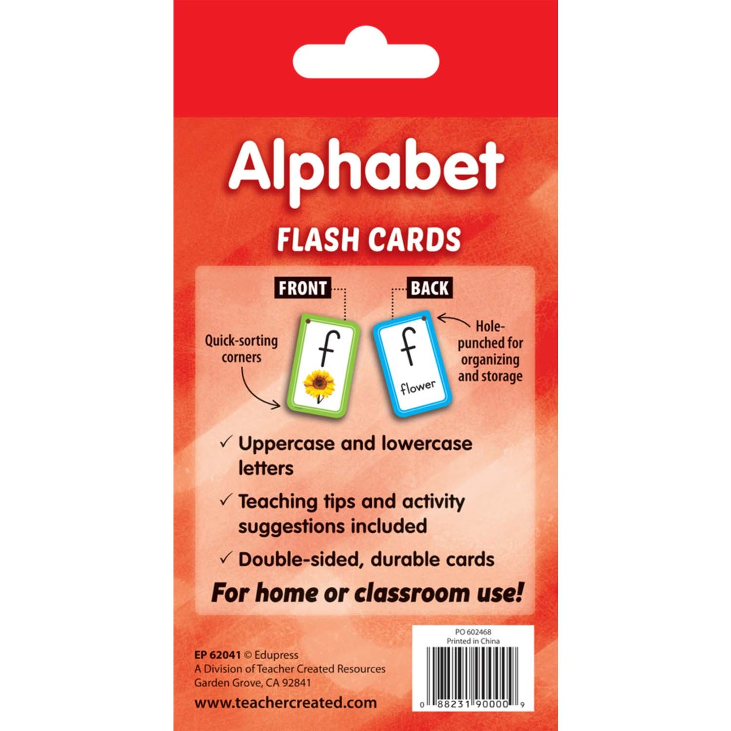 Teach and review the alphabet individually, in groups, or with the whole class! Each flash card set contains a collection of full-color, high-interest student cards as well as instructions and tips for the teacher or parent, suggested activities, and additional blank cards. Each card has a hole in the top corner that can be fit with a ring or string to help with organization and storage. Additionally, each card has one corner that is shaped differently than the others. By lining up the non-rounded corners, the flash cards can quickly be faced in the same direction. When applicable, flash card sets include answers in small print on the reverse side of each card. Each card measures 3-1/8" x 5-1/8". Each set includes 56 double-sided cards.