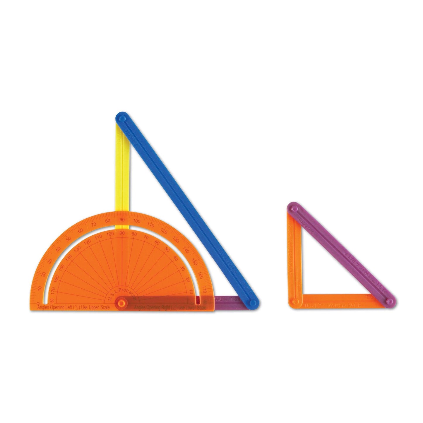 AngLegs™ come in six lengths that easily snap together to motivate students to explore plane geometry on their desktop or the overhead projector. Students will discover what happens as they use the same length legs verses different length legs to build various polygons, as they attach additional legs they study polygon heights, calculate their areas, find center points and much more! When two AngLegs™ of any length are snapped onto the special 4" protractor students will explore angles, add a third leg for triangles, a forth for quadrilaterals, and so on. This 74-piece set consists of 72 AngLegs™12 each of six different lengths in six colors and two snap-on View Thru™ protractors. This exciting new manipulative includes a set of 15 activity cards, divided into three sections for grades K-2, 3-5 and 6-8. All activities adhere to the NCTM Standards for geometry.