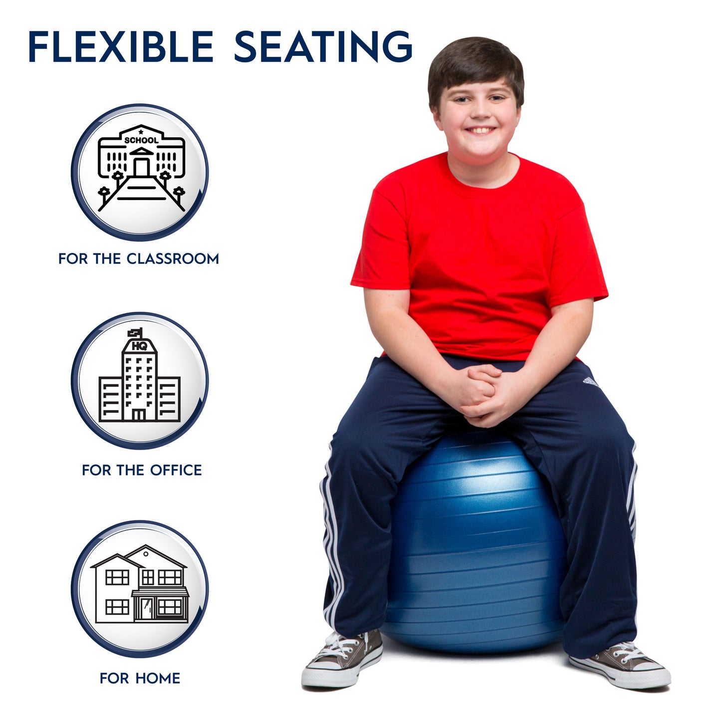 Non-roll away weighted balance ball offers a flexible chair for school and home enabling increased focus and improved performance. STAYS IN PLACE - Reduces fidgeting and increases concentration with an original weighting feature keeping it in place when not in use. INCREASE FOCUS - Keeps the mind engaged as the constant ball movement increases blood flow to the brain. STRESS RELIEF - Improves performance by providing an outlet for excess energy alleviating anxiety, stress and boredom. IMPROVES POSTURE - Builds core strength and a healthy posture.