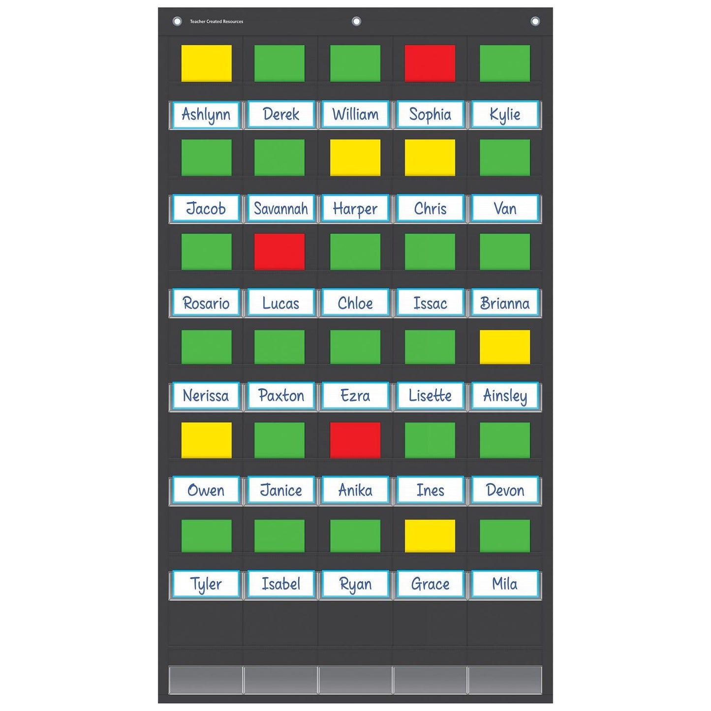 This lightweight and durable Behavior Pocket Chart hangs easily from sturdy, metal grommets. Easily keep track of student behavior with this handy pocket chart. The large chart provides students with a visual reference to help them stay motivated and on task. Includes 90 student name cards and 40 red, 40 yellow, and 40 green behavior cards. 35 pockets with clear name slots. The non-porous surface is easy to clean and can be wiped-down or sprayed with disinfectant to help prevent the spread of germs. Measures 21" x 37".