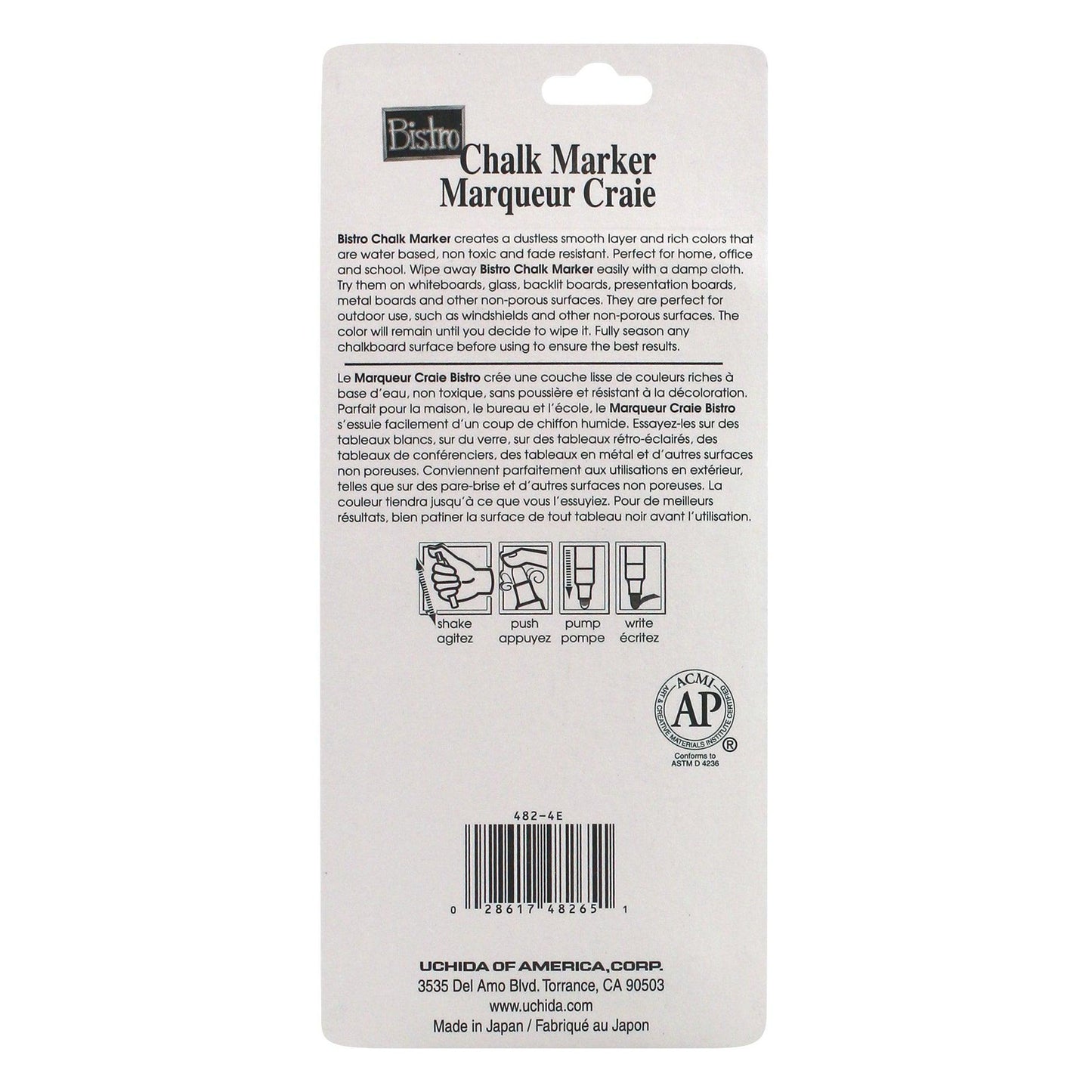 Use fine point Bistro Chalk Markers on chalkboards, light boards, windows, windshields, and most non-porous surfaces. A wonderful way to create chalkboard art to attract attention and increase sales. They are opaque, water based, pigmented, erasable with a damp cloth. Each pack includes 4 markers: white, red, blue and green. Sold as 2 packs for a total of 8 markers.
