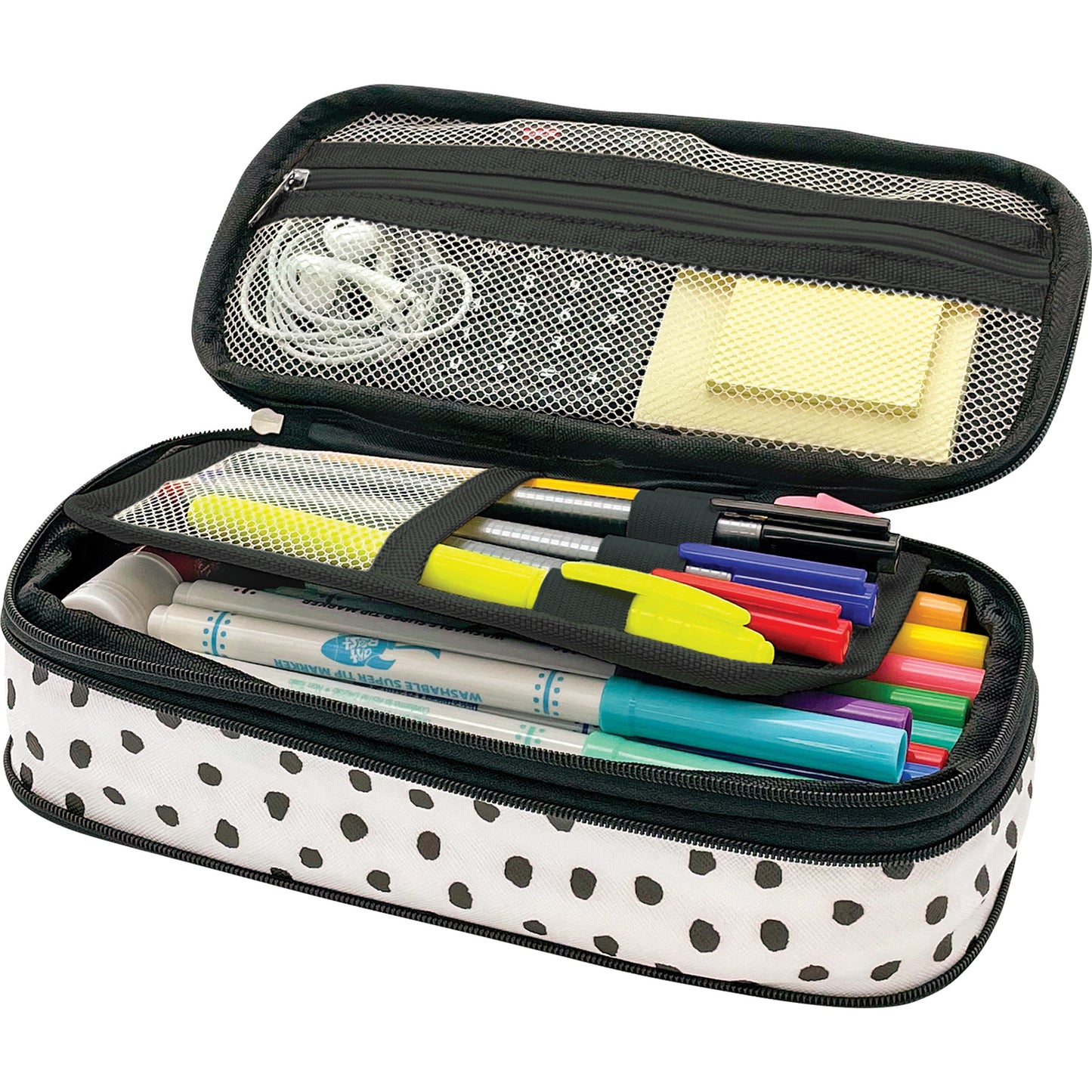 The stylish pencil case can expand and hold approximately 50 pens or pencils. Case is sturdy, durable, and has multiple zippers and pockets. Measures 9" L x 4-1/4" W. Wrap-around expansion zipper allows thickness to go from 1-3/8" to 2-1/2" in an instant! Front pocket keeps frequently used item easily accessible. Store small items in a zippered mesh compartment. 5 elastic pen slots keep pens or brushes from moving.