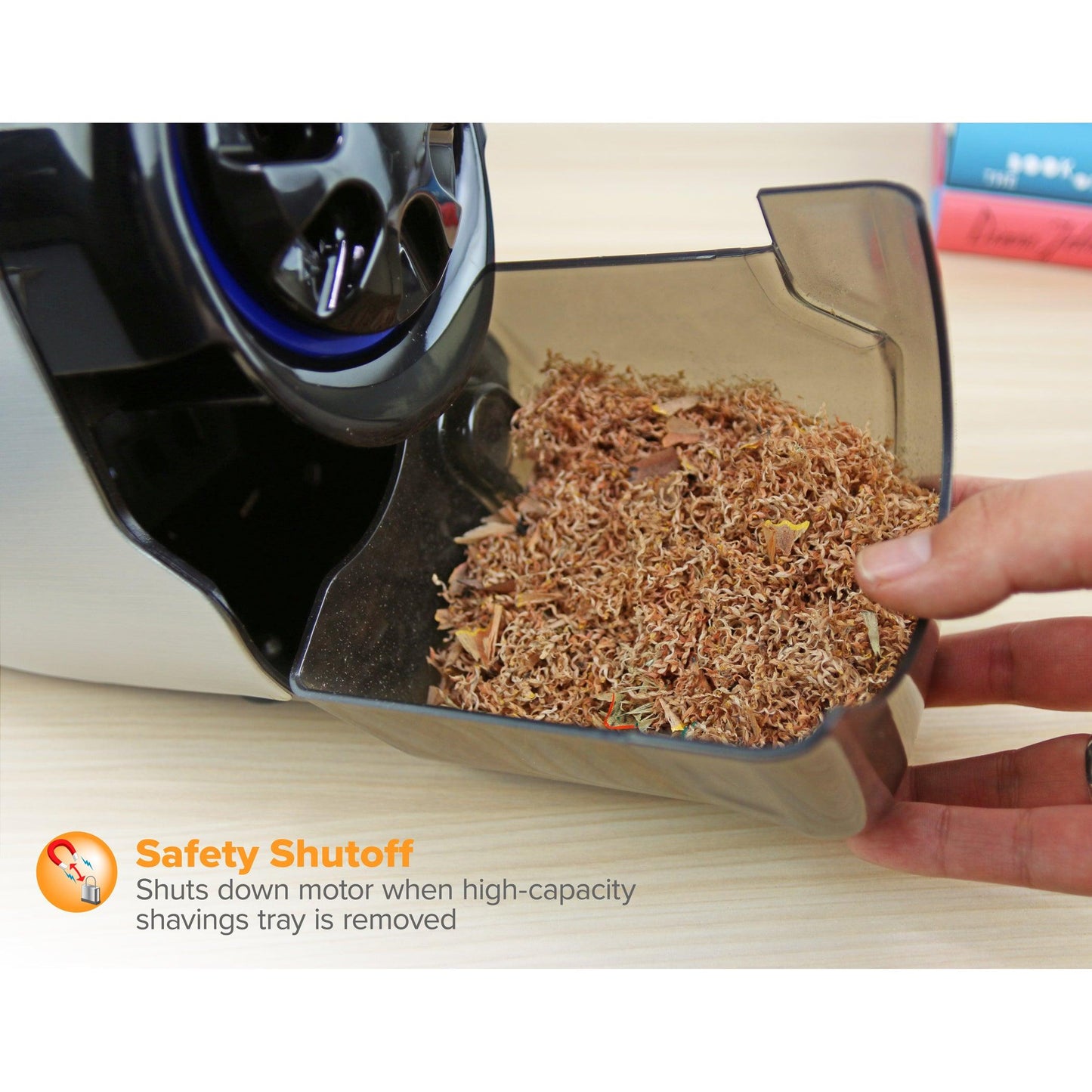 With XHC cutter technology, enjoy 70% faster sharpening and 10x longer cutter life. The super duty motor and thermal overload protection allow continuous sharpening without overheating. The giant shavings tray, featuring a MagnaSafe tamper-proof safety switch, ensures safety in classrooms with young children. The sleek brushed metal case and curved shape offer class-leading style and durability.