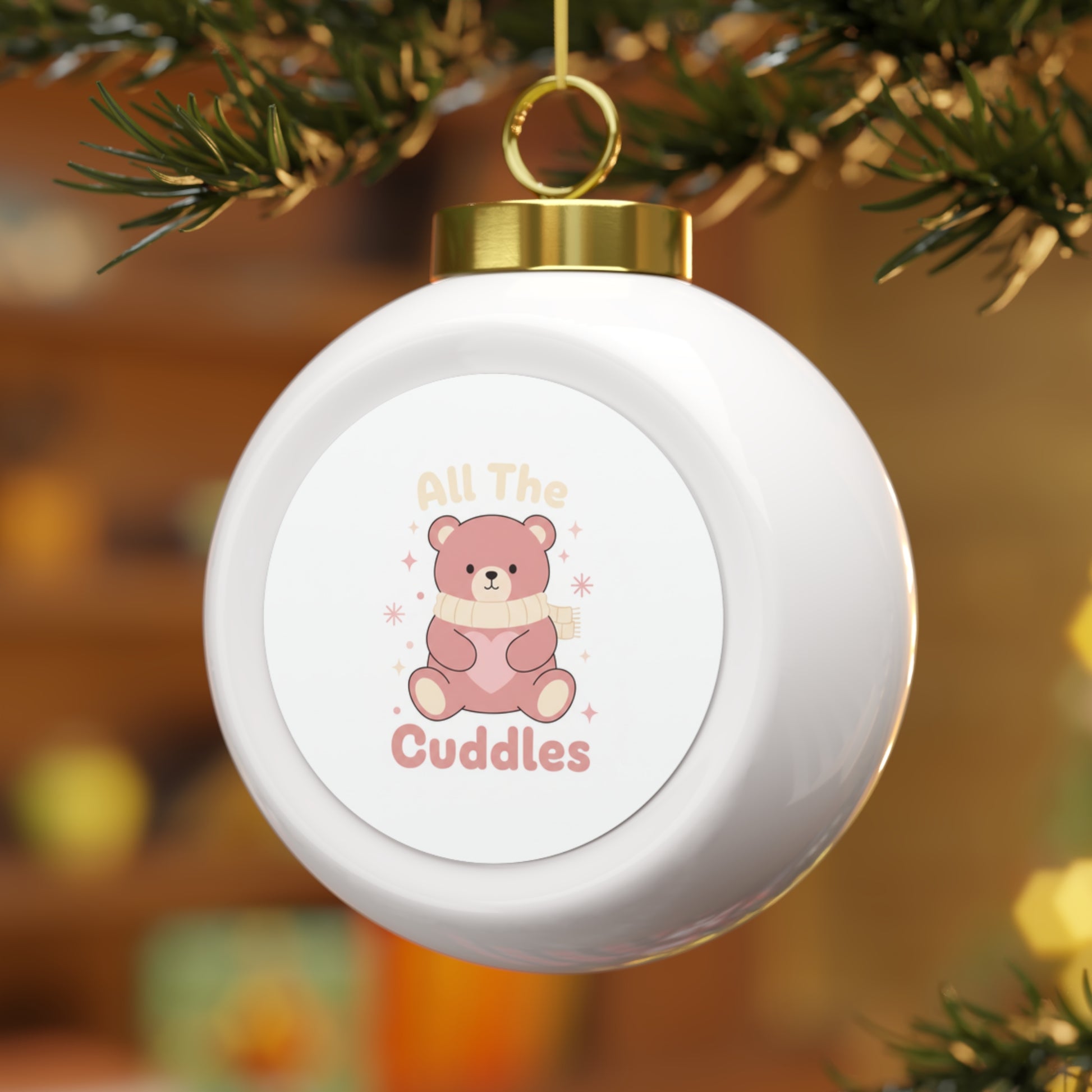 Glossy 3" ceramic ornament featuring the playful "All The Cuddles" text as a centered design. Includes a gold ribbon for easy hanging and a vintage-style back detail. A cozy, gift-ready decoration perfect for adding warmth to any tree or holiday display.