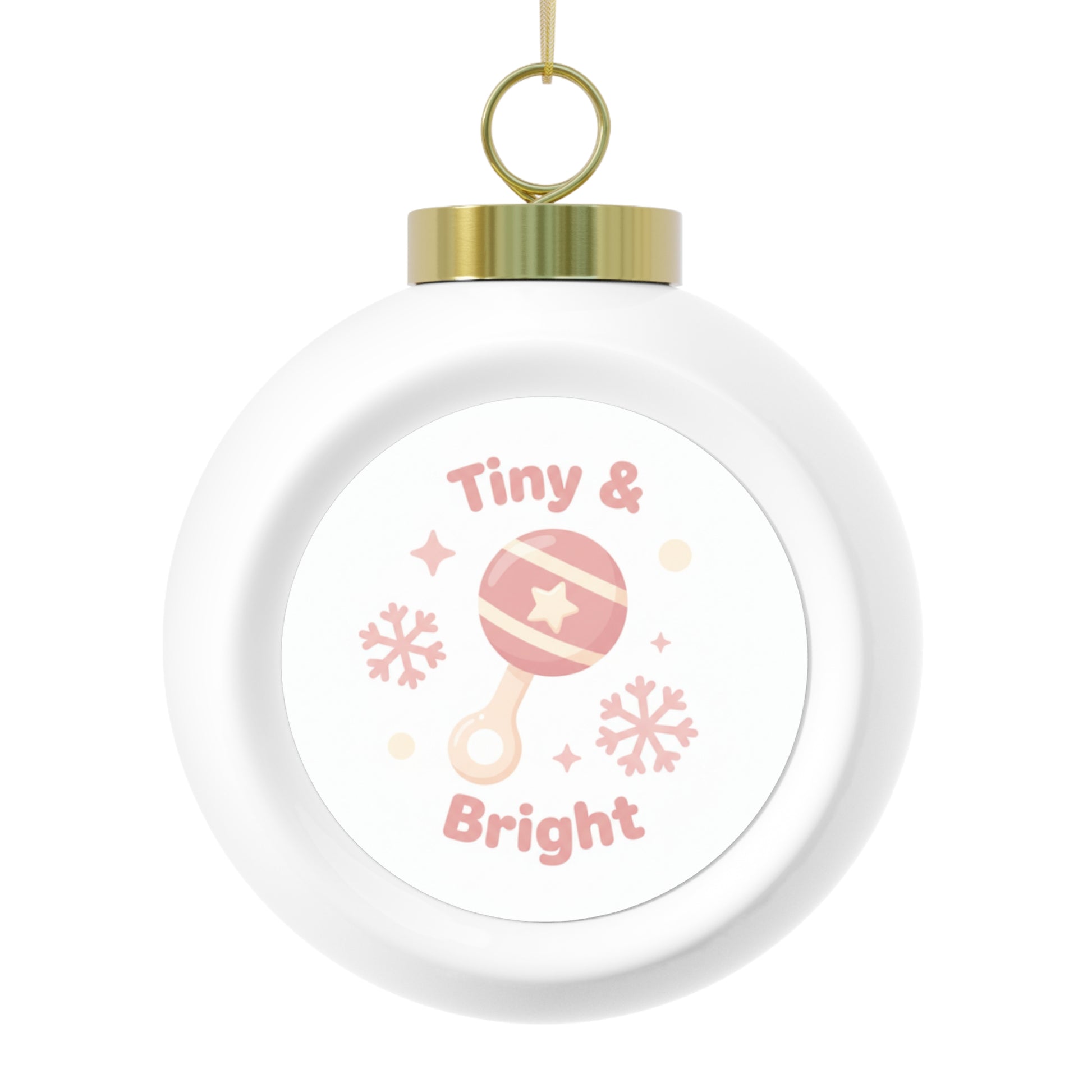 A 3-inch glossy ceramic ball ornament featuring the cheerful phrase Tiny & Bright in a clean, vintage-inspired layout. Perfect for adding a subtle, festive accent to your tree or for a thoughtful holiday gift. Includes a gold ribbon for hanging and a durable insert to keep colors vibrant.