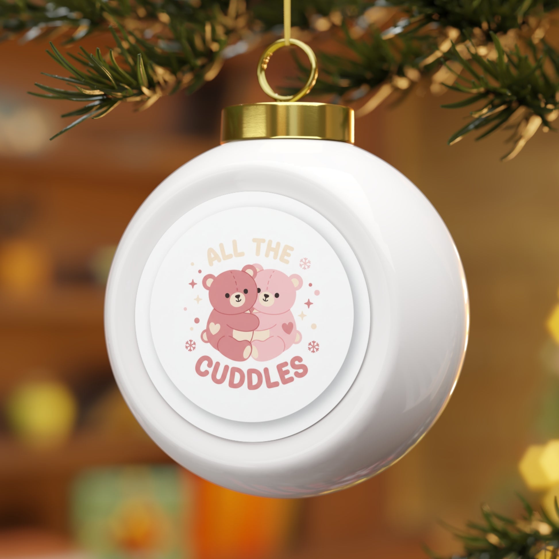 A glossy 3" ceramic Christmas ball ornament featuring the sweet All The Cuddles design. Includes a gold ribbon for easy hanging and a vintage-style back detail. The custom aluminum insert keeps the artwork crisp and festive. Ideal for gifting or adding a cozy, sentimental touch to your holiday tree.