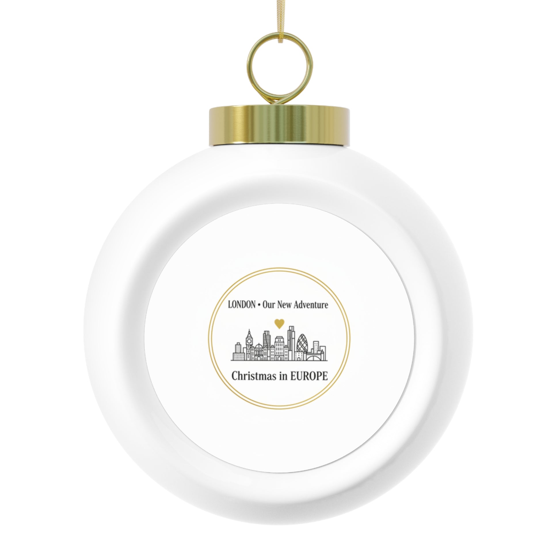 Glossy 3" ceramic ball ornament featuring a clean, customizable [CITY] • Our New Adventure design. Perfect for celebrating a move, new home, or memorable trip. Includes a gold ribbon for hanging and a durable printed insert for long-lasting color. Vintage-inspired style adds a timeless touch to any tree.