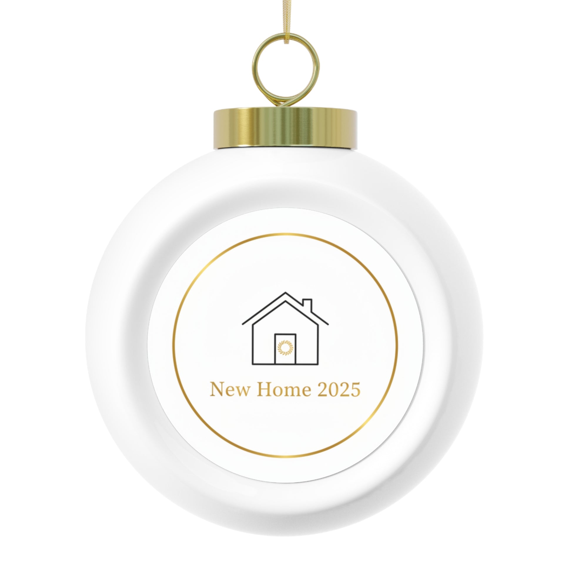 Glossy ceramic Christmas ball ornament featuring a classic New Home 2025 design, perfect for commemorating a first holiday in a new house. Vintage-style finish with a gold ribbon for easy hanging. Compact 3" size makes it ideal for tree display or a keepsake gift.