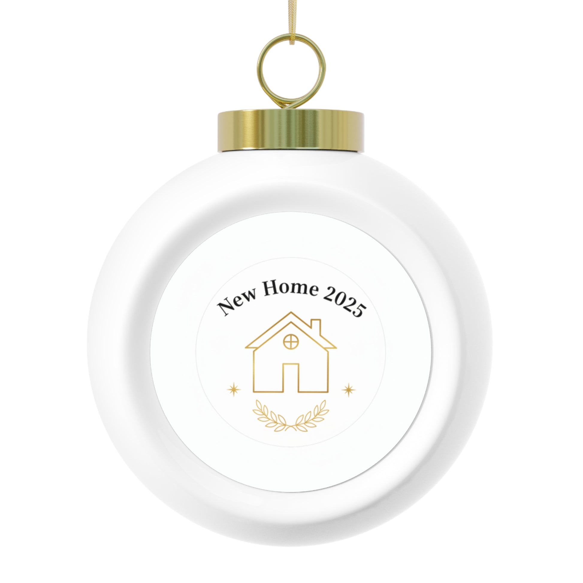 A glossy 3" ceramic Christmas ball ornament featuring a vintage-style New Home 2025 design — perfect for celebrating a first holiday in a new house. Comes with a gold ribbon for hanging and a decorative tree or bell on the back. Makes a meaningful keepsake or housewarming gift to add a personal touch to holiday décor.