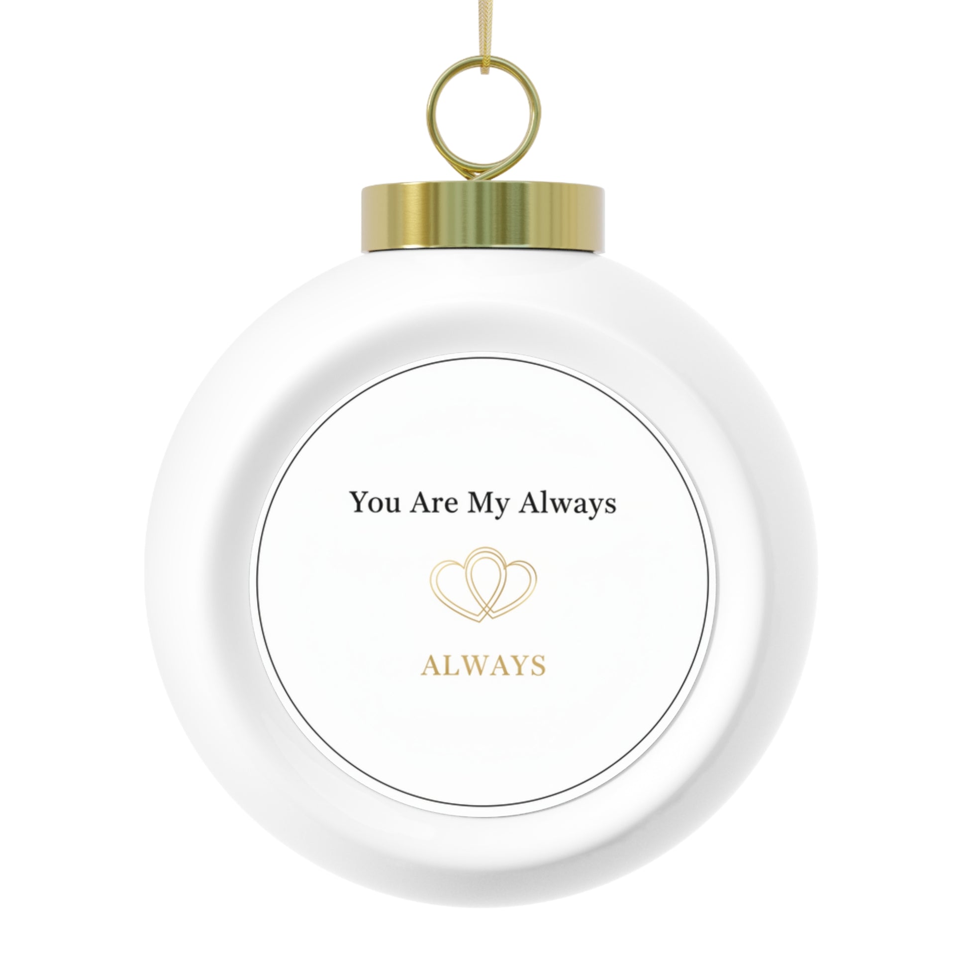 This 3" glossy ceramic Christmas ball ornament features the sentimental phrase You Are My Always in elegant typography. It comes ready to hang with a gold ribbon and adds a romantic, vintage-inspired touch to any tree. Perfect as a heartfelt holiday gift for a partner, spouse, or loved one.