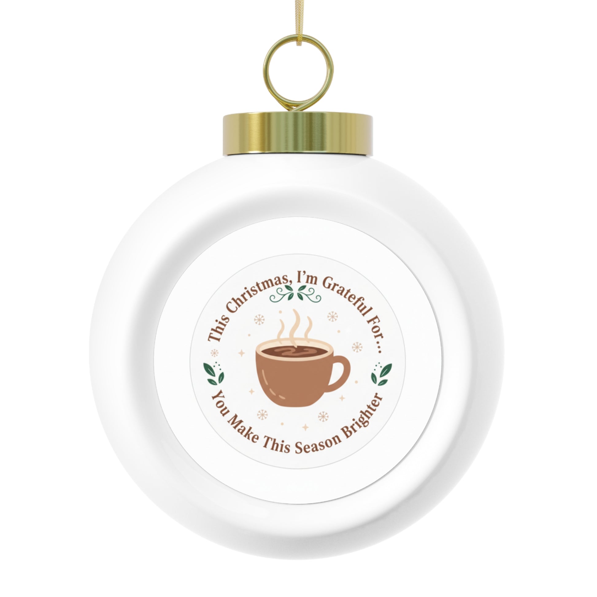 Glossy 3-inch ceramic Christmas ball ornament featuring the uplifting sentiment You Make This Season Brighter in a vintage-inspired design. Includes a gold ribbon for easy hanging and a tree or bell decoration on the back. The printed aluminum insert gives a crisp, durable finish. A heartfelt keepsake that makes a thoughtful holiday gift or stocking stuffer.