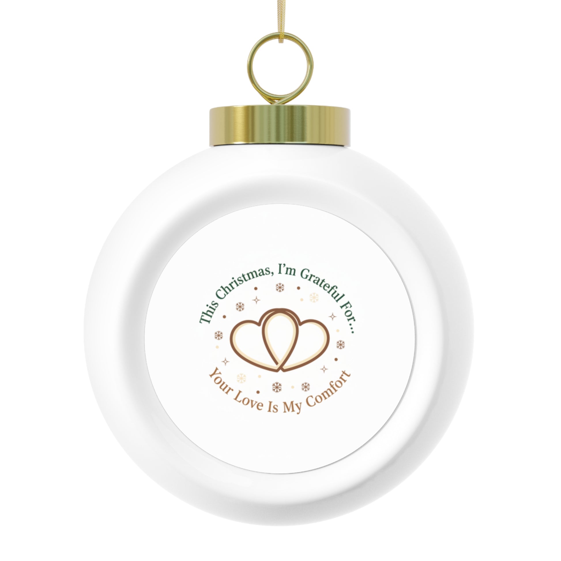 Glossy ceramic 3" Christmas ball ornament featuring the heartfelt phrase Your Love Is My Comfort in a vintage-inspired style. Comes with a gold ribbon for hanging and a decorative tree or bell on the back. Perfect for gifting or adding a personal, sentimental touch to your holiday tree.