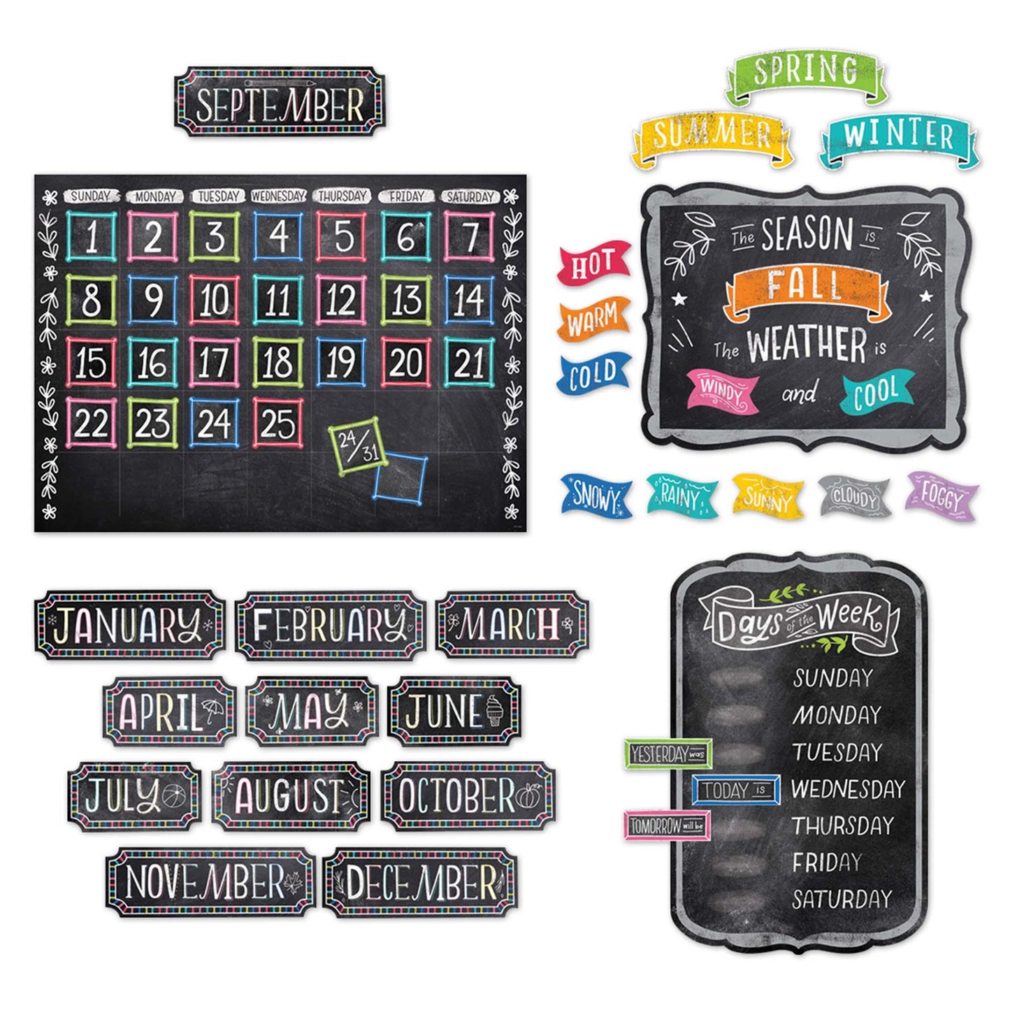 i : Use the moveable pieces on this Chalk It Up Calendar Bulletin Board to teach calendar concepts, display the month of the year, the days of the week, and record the changing seasons and daily weather conditions.