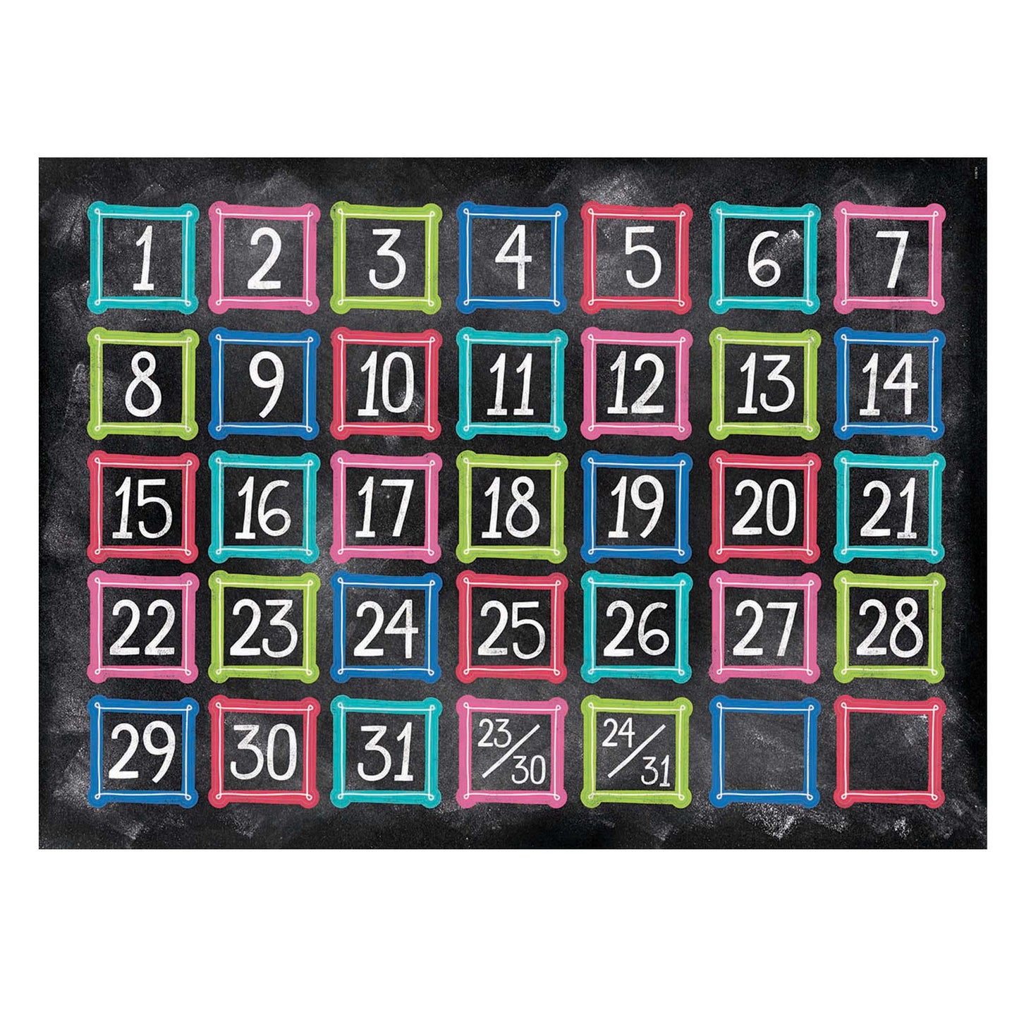 This Chalk It Up! Calendar Set is designed with bright pops of color on a traditional chalk style background. Use the moveable pieces to teach calendar concepts, display the month of the year, the days of the week, and record the changing seasons and daily weather conditions. This 67-piece classroom calendar set includes a calendar chart, 12 month headlines, 33 pre-numbered calendar days, and 2 blank calendar days. The set also includes a days-of-the-week chart, a seasons and weather chart, and coordinating labels. The pops of color and white text on blackboard background make this set perfect for children at home or at daycare, preschool, or elementary school.