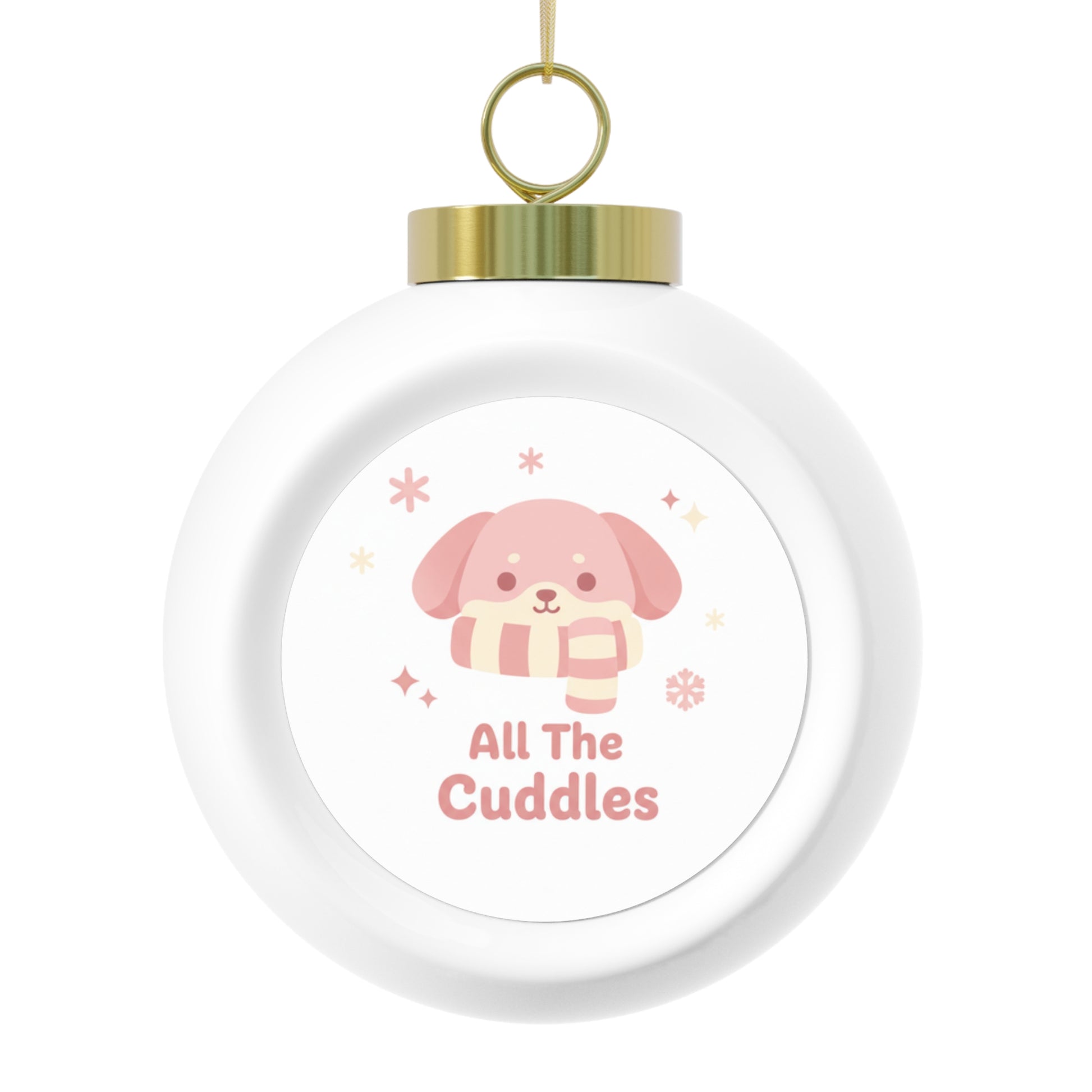 A glossy 3-inch ceramic Christmas ornament featuring the cheerful All The Cuddles phrase in a warm, playful design. Includes a gold ribbon for hanging and a vintage-style aluminum insert for a polished look. Perfect for gifting or adding cozy, cuddly charm to your holiday tree.