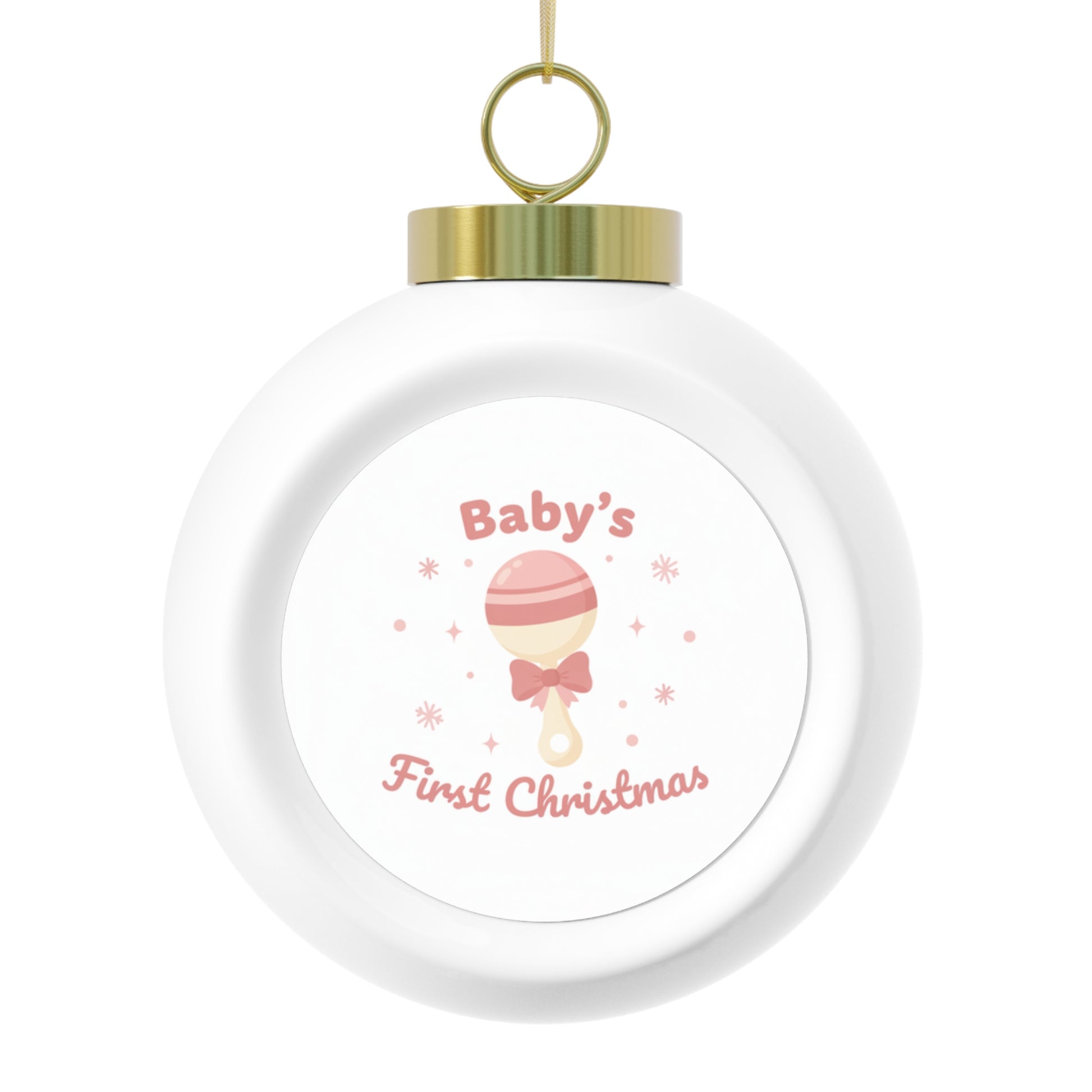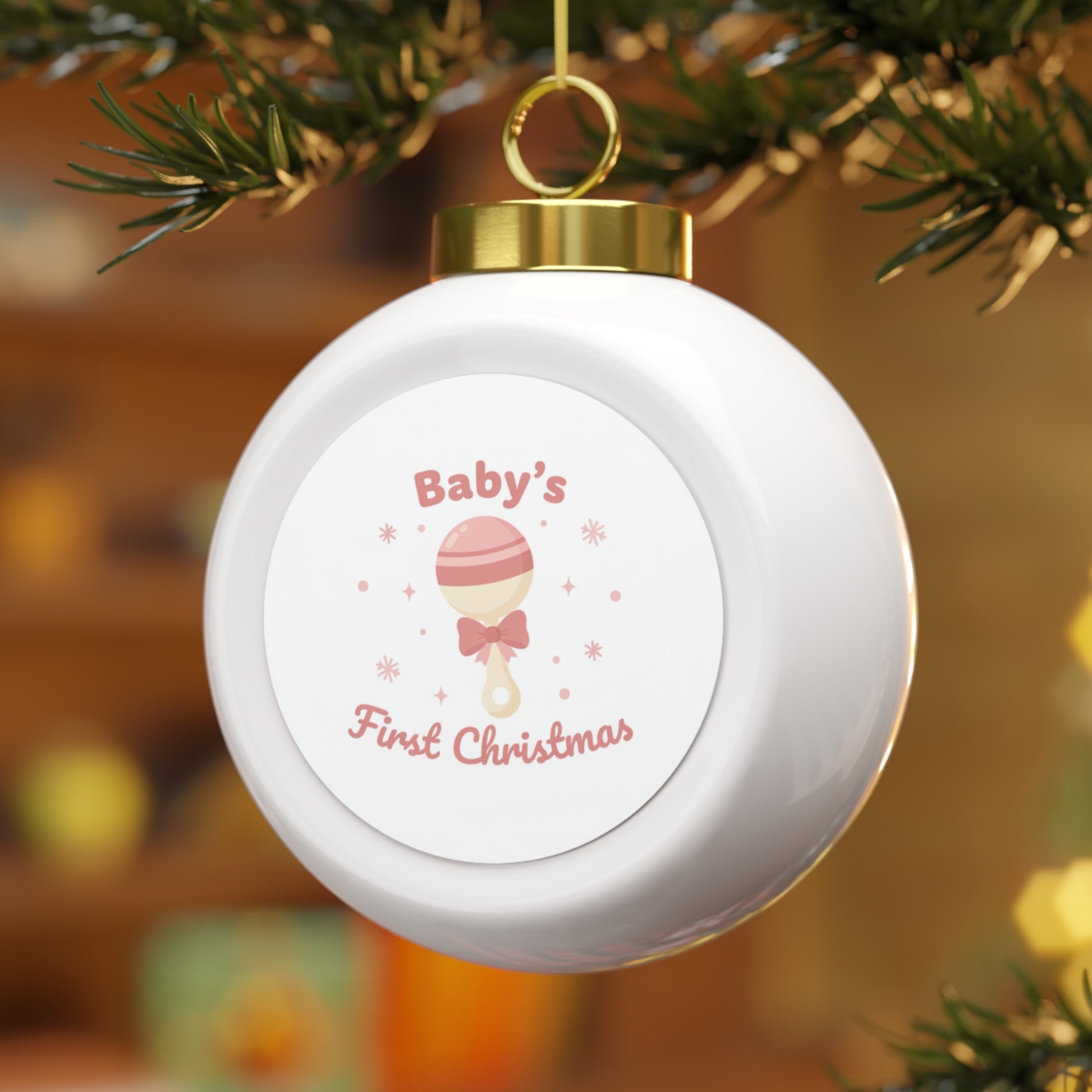 Celebrate Baby's First Christmas with this glossy ceramic ball ornament featuring a classic holiday design. The 3" ornament has a vintage-inspired look and comes ready to hang with a gold ribbon. A small keepsake perfect for the tree or as a thoughtful gift for new parents.