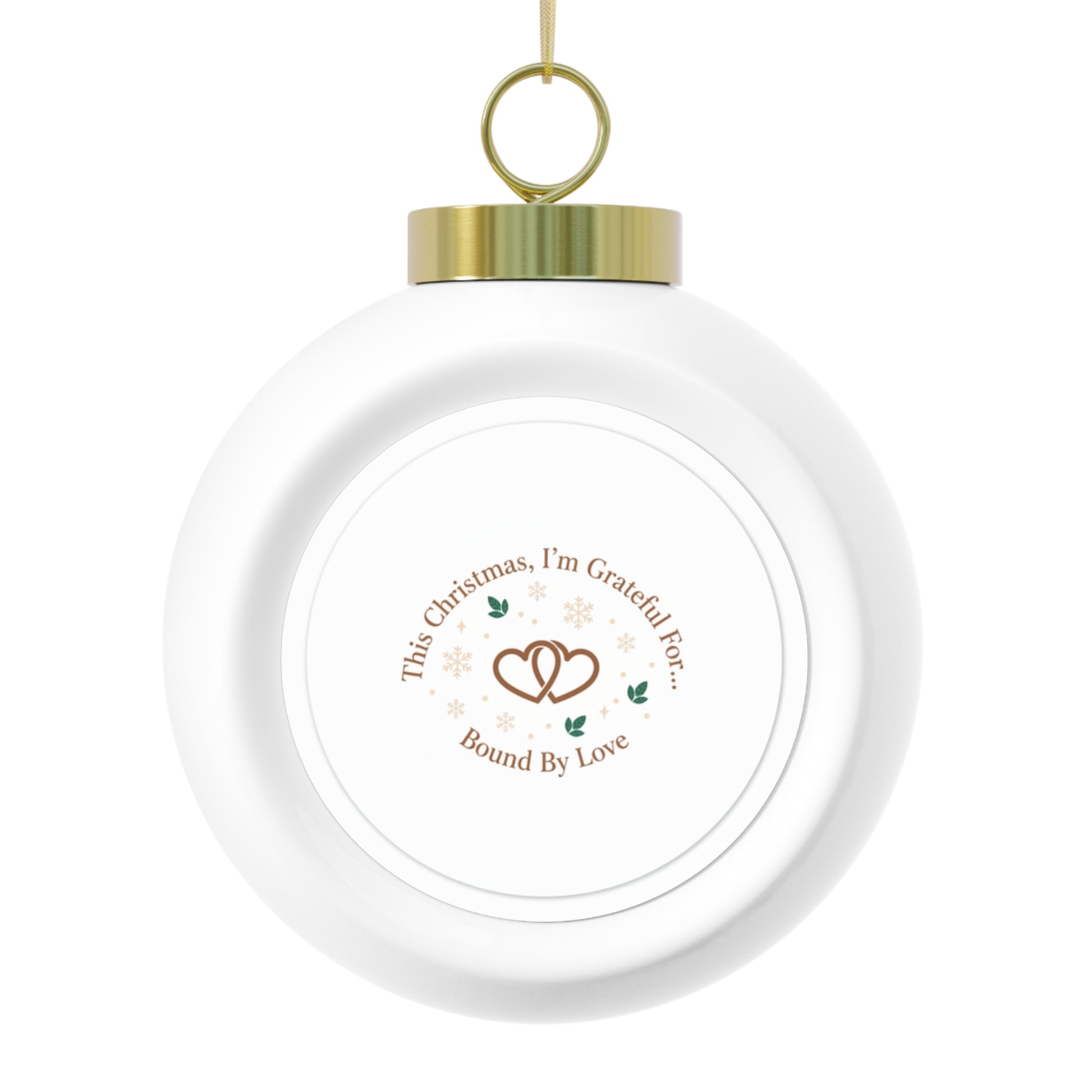 A glossy ceramic Christmas ball ornament featuring the phrase Bound By Love in a timeless, elegant script. The vintage-style piece comes with a gold ribbon for hanging and a durable printed inset to keep the design crisp. Perfect as a romantic holiday keepsake, gift, or anniversary tree accent.