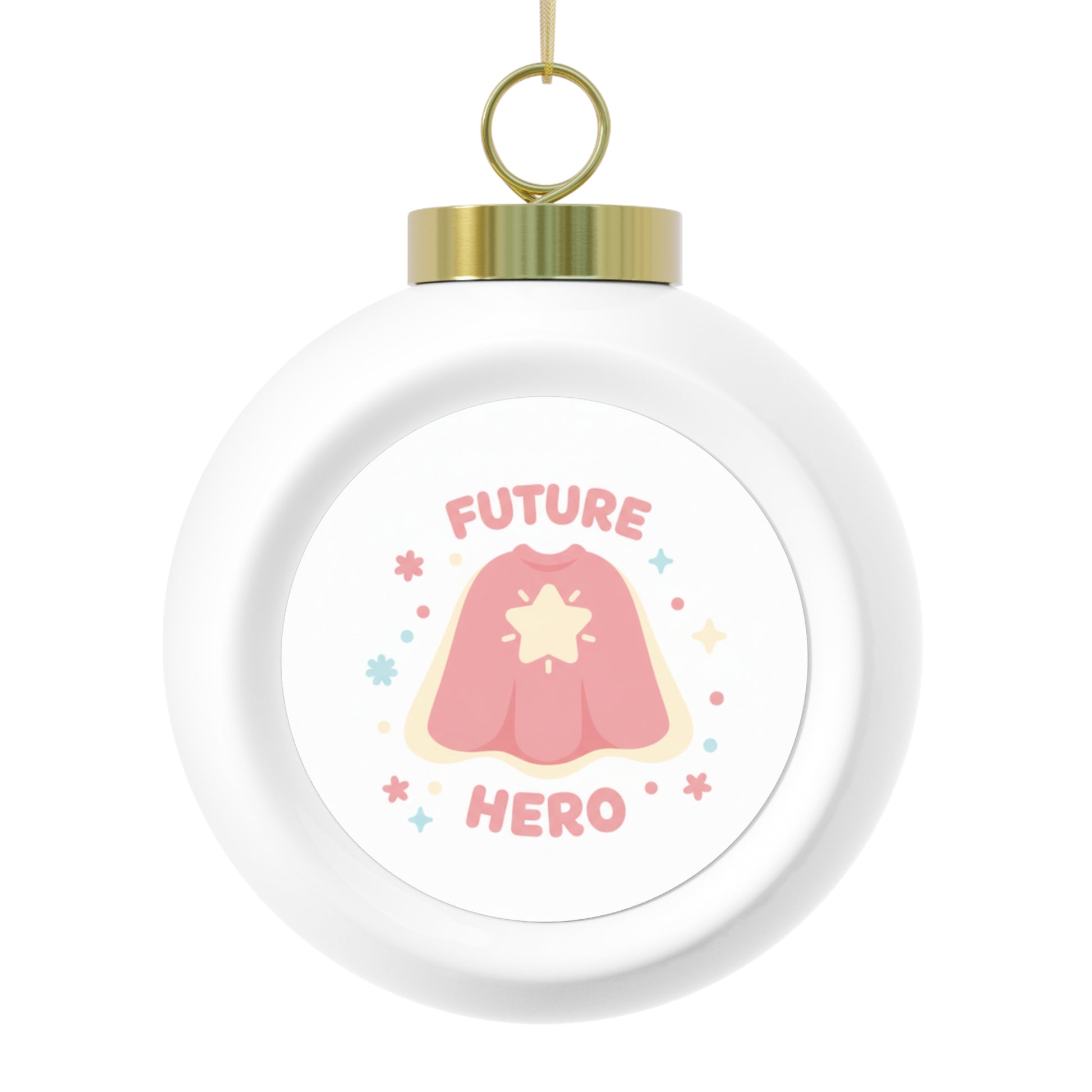 Glossy 3" ceramic Christmas ball ornament featuring the bold phrase Future Hero printed on a durable aluminum insert. Comes ready to hang with a gold ribbon and a vintage-style back accent. A thoughtful keepsake for kids, new parents, or anyone you want to celebrate on the tree.