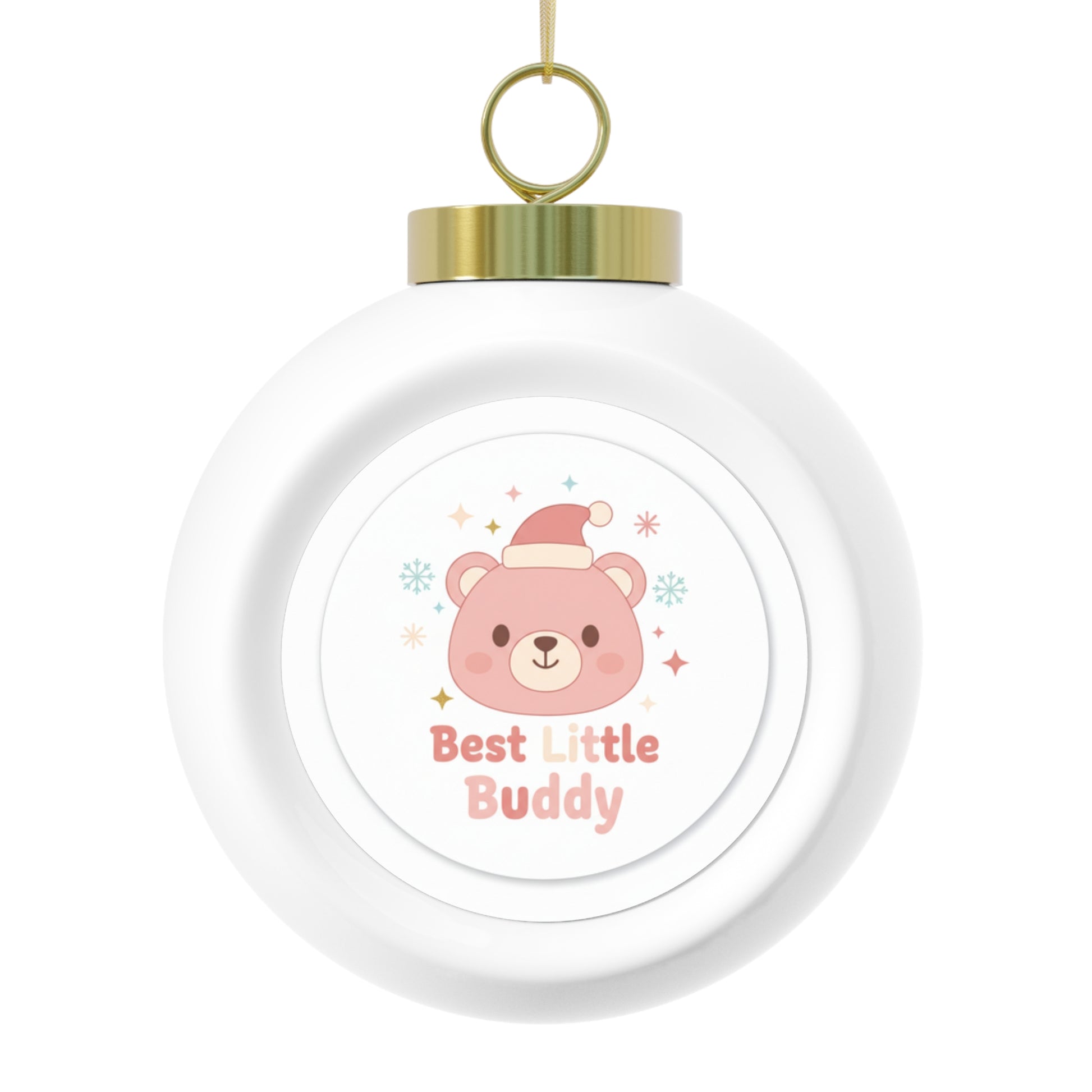 This glossy ceramic 3" Christmas ball ornament features the cheerful "Best Little Buddy" message printed on a durable aluminum insert. It includes a gold ribbon for easy hanging and a vintage-style finish with a tree or bell detail on the back. A sweet keepsake gift perfect for kids, pets, or a beloved friend.