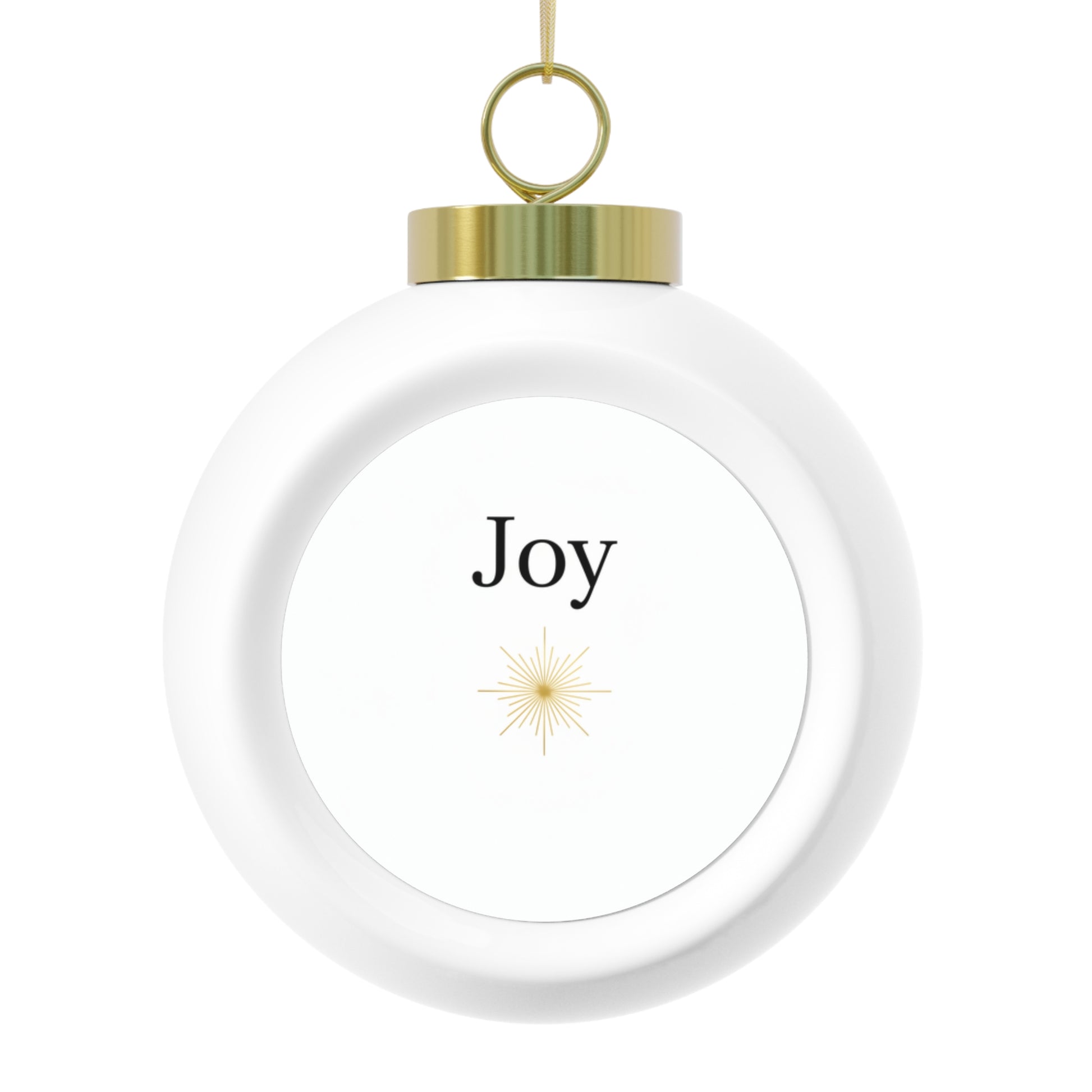 An elegant ceramic Christmas ball ornament featuring the hand-lettered word Joy centered on a glossy finish. The simple, classic design complements both traditional and modern holiday decor. Comes ready to hang with a gold ribbon and a vintage-style back accent, making it a lovely keepsake or gift.