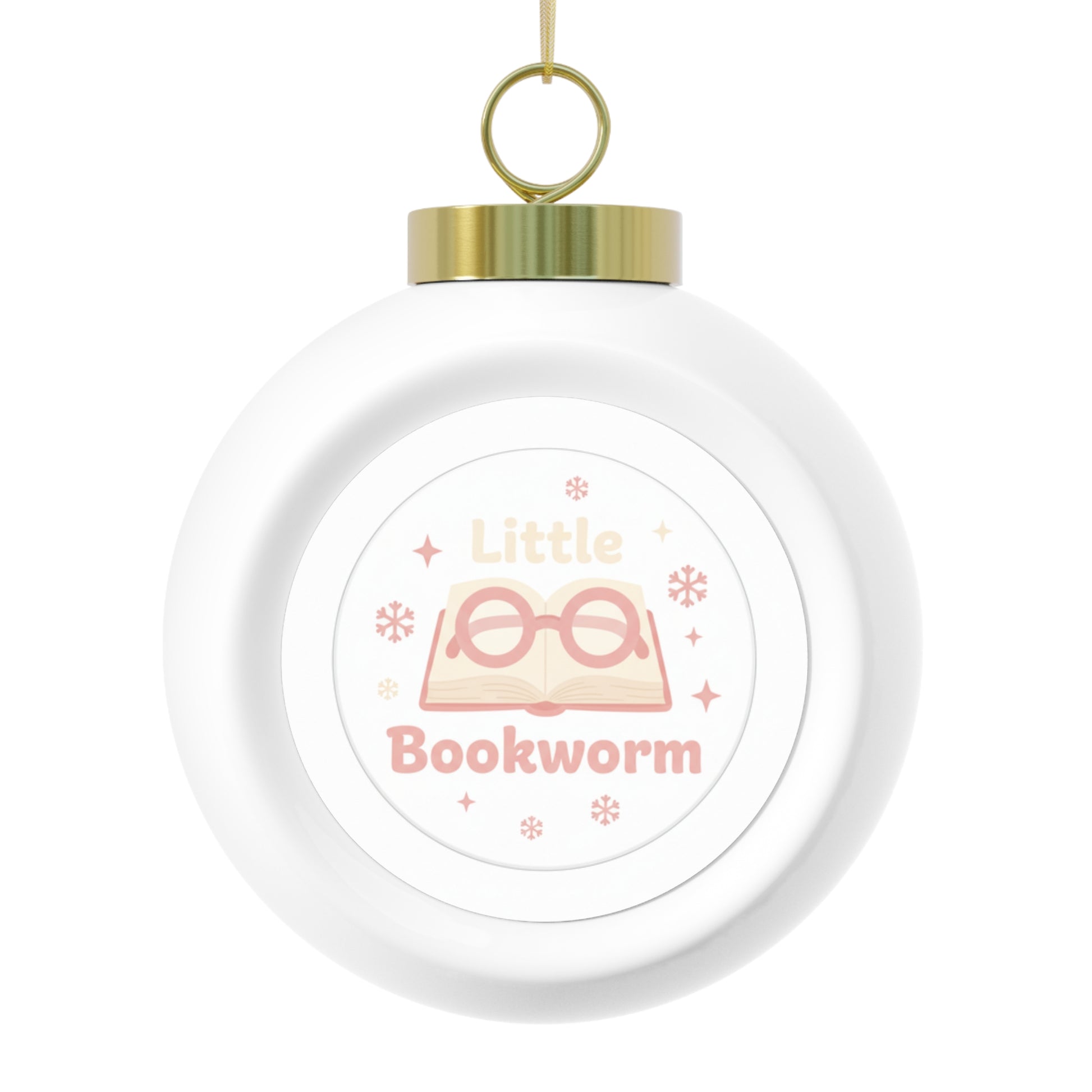 A glossy 3" ceramic Christmas ball ornament featuring a cute Little Bookworm design—perfect for book lovers and young readers. Comes with a gold ribbon for easy hanging and a vintage-style aluminum insert for a special pop of color. A charming, personal touch for any holiday tree or gift.