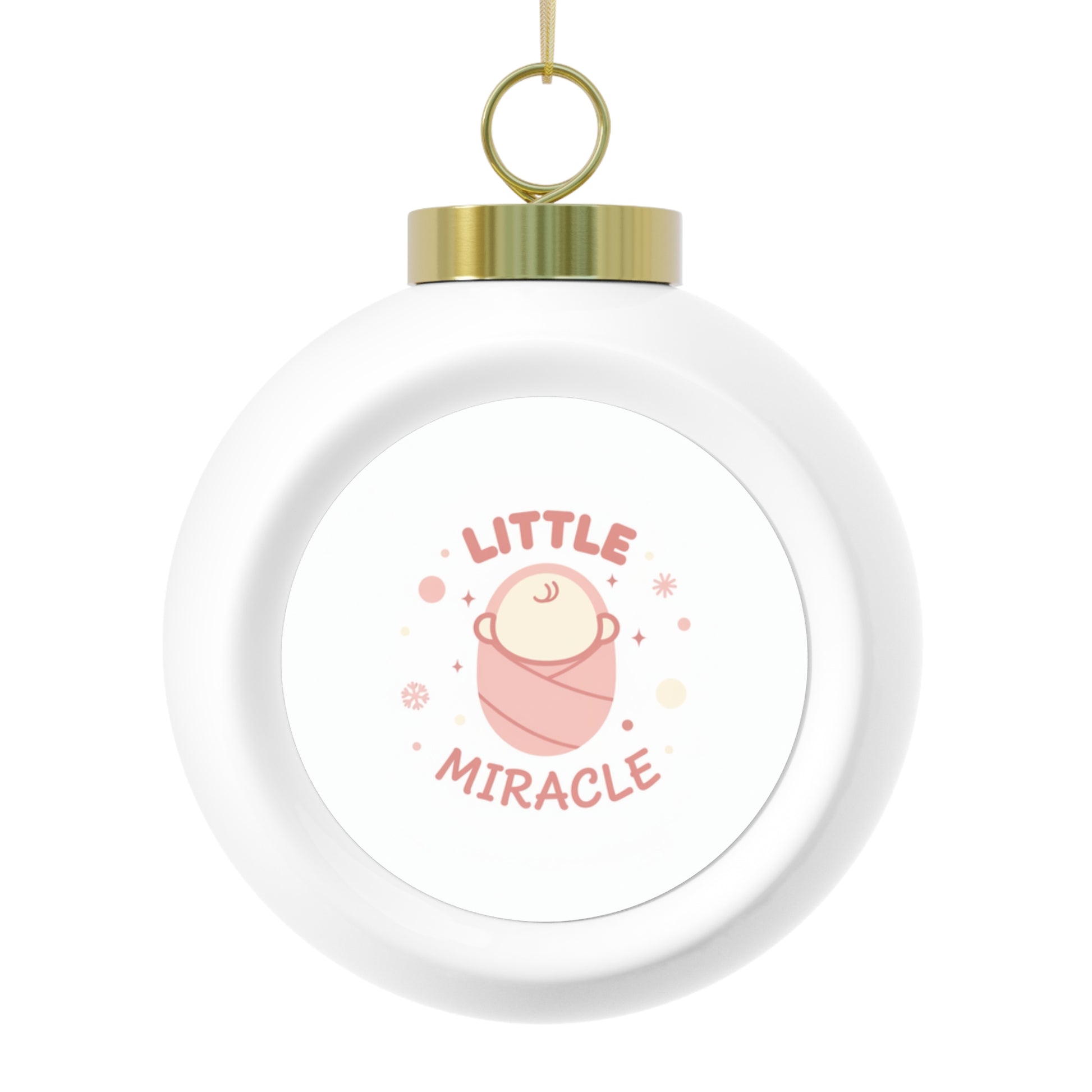 A glossy 3" ceramic Christmas ball ornament featuring the heartfelt "Little Miracle" sentiment in a vintage-inspired style. Perfect for baby announcements, new-parent keepsakes, or celebrating a small holiday miracle. Comes ready to hang with a gold ribbon and makes a thoughtful tree decoration or gift.