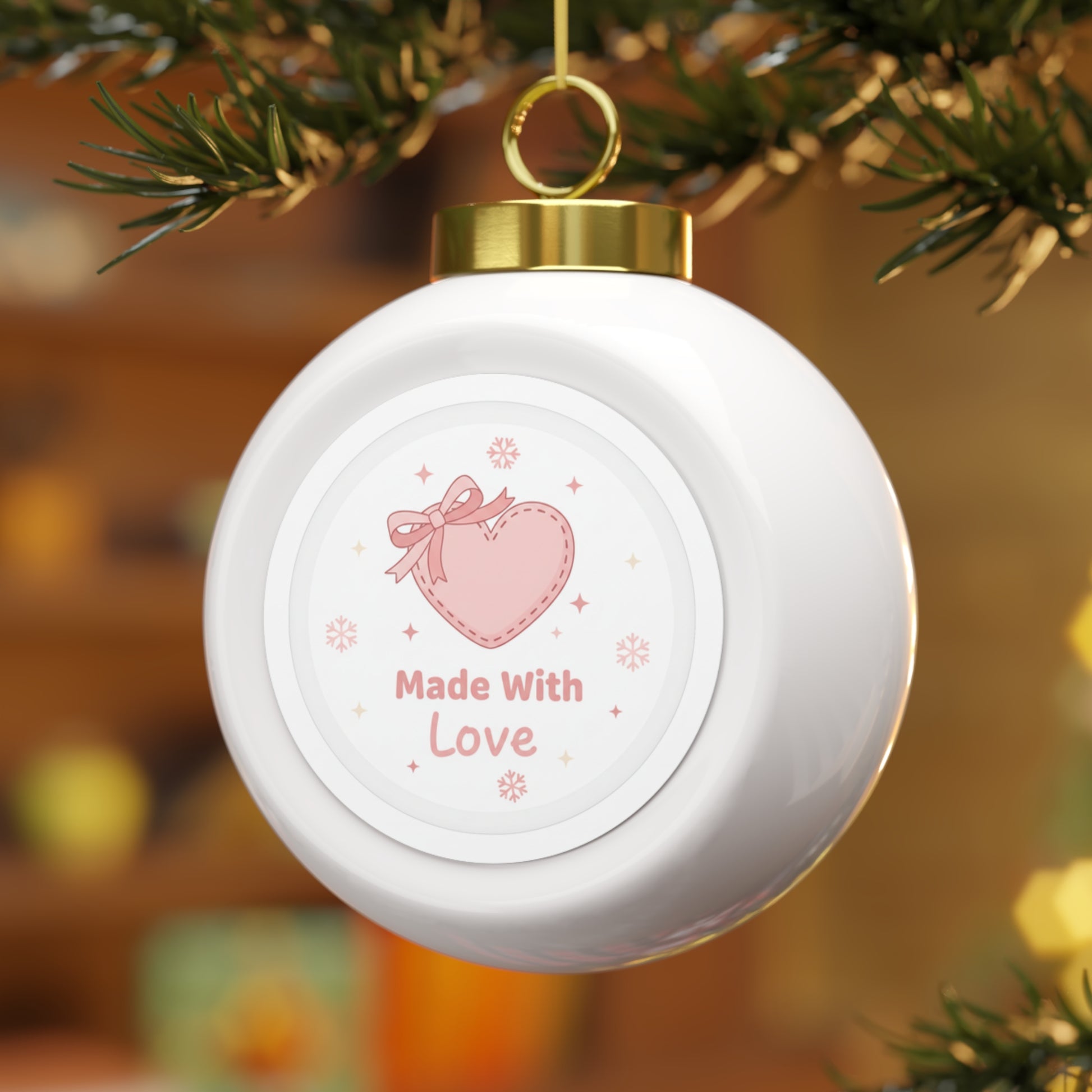 A glossy 3" ceramic Christmas ball ornament featuring the phrase Made With Love in a warm, vintage style. Comes with a gold ribbon for easy hanging and a decorative aluminum insert on the back. Perfect for gifting, homemade treats, or adding a personal touch to your holiday tree.