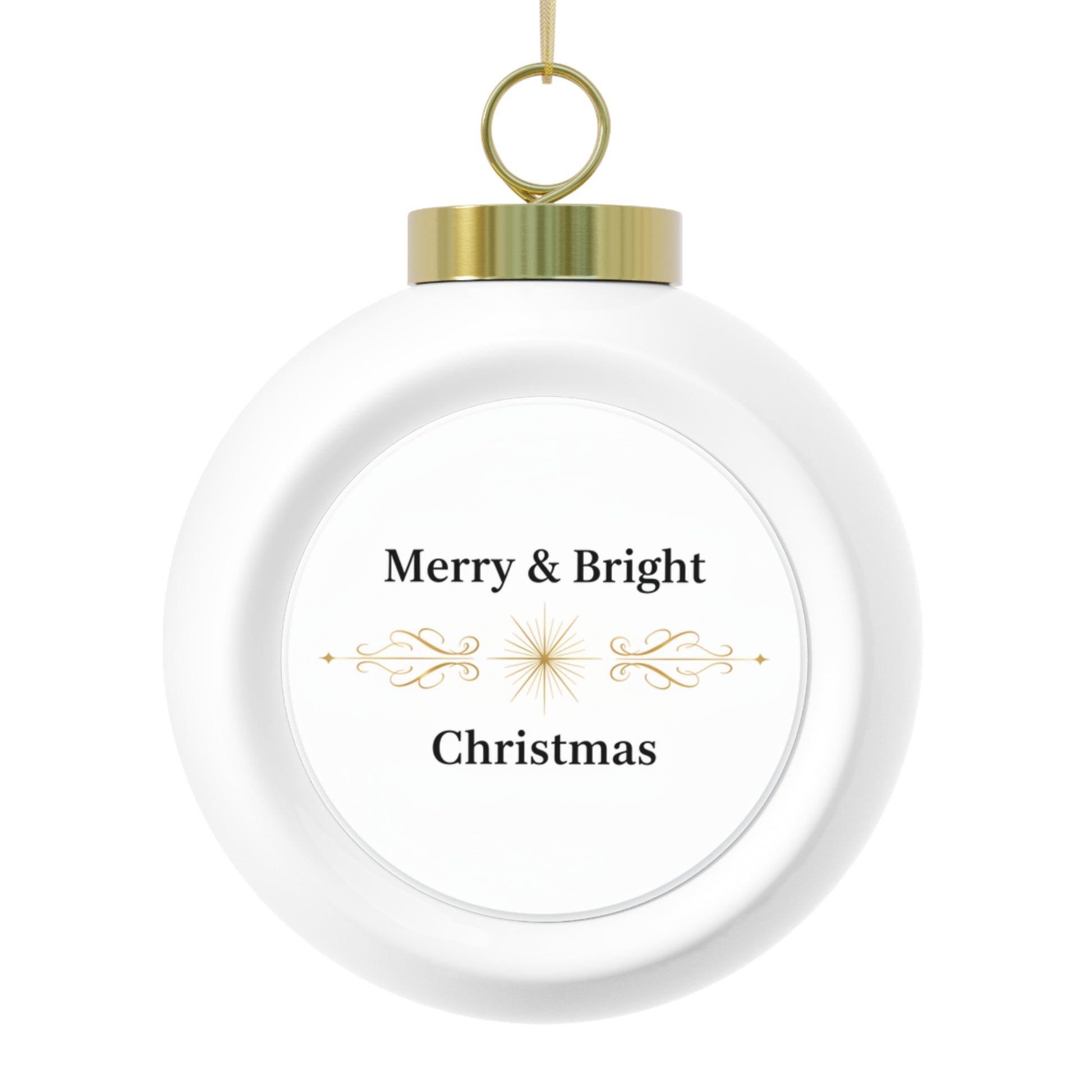 Glossy 3" ceramic Christmas ball ornament featuring cheerful "Merry & Bright" lettering in a vintage-inspired style. The crisp print sits on an aluminum insert and the ornament arrives ready to hang with a gold ribbon. A simple, festive accent perfect for trees, gift tags, or seasonal decor.