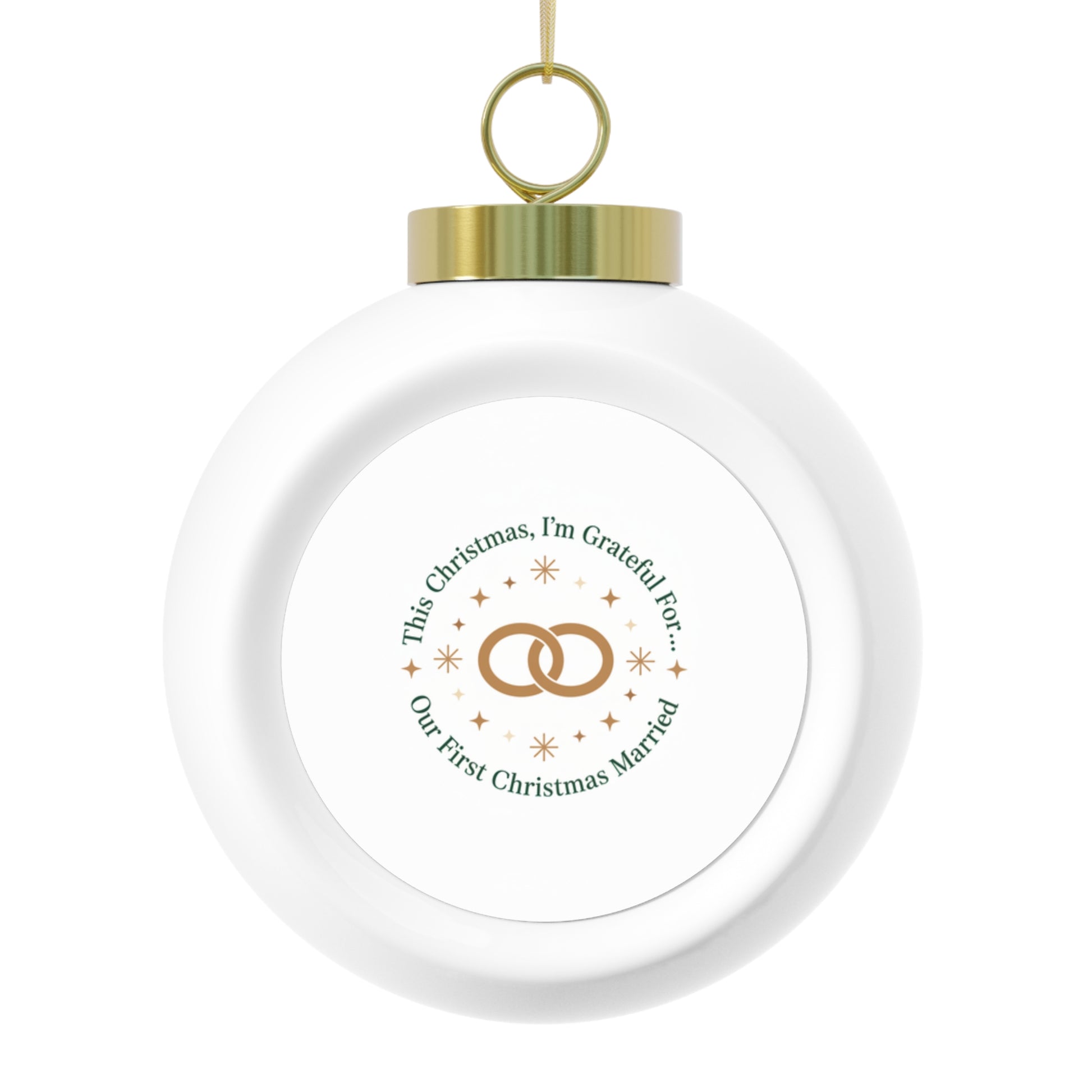 Glossy 3" ceramic Christmas ball ornament featuring the text Our First Christmas Married in a vintage-inspired style. Includes a gold ribbon for easy hanging and a tree or bell decoration on the back. A compact, timeless keepsake for newlyweds celebrating their first holiday together. Custom printed on an aluminum insert for crisp, long-lasting detail.