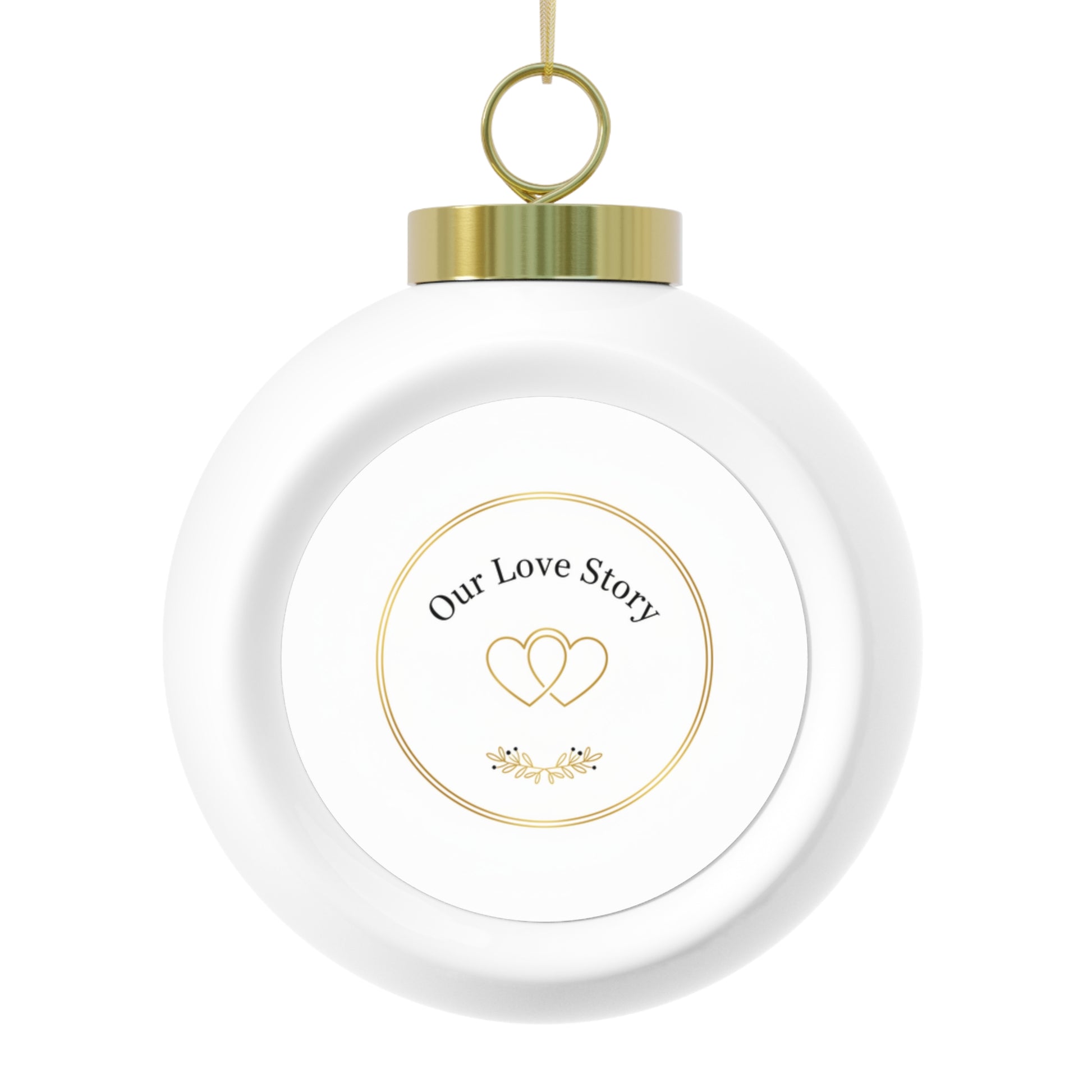 A glossy ceramic Christmas ball ornament featuring the heartfelt phrase Our Love Story in a vintage-inspired design. It comes with a gold ribbon for easy hanging and a decorative back detail for extra charm. Perfect as a sentimental tree ornament or gift for couples, anniversaries, and newlyweds.