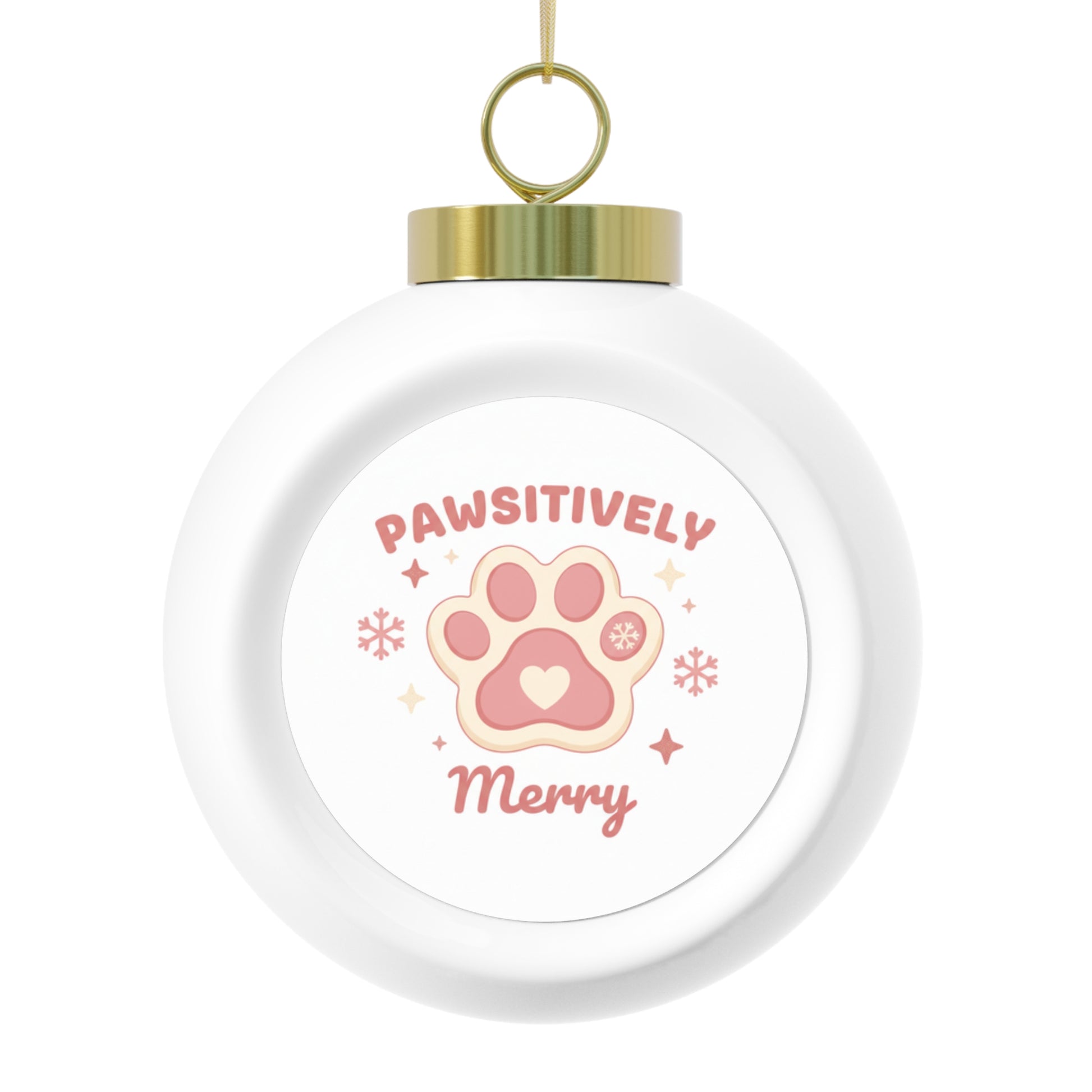 Glossy 3" ceramic Christmas ball ornament featuring the playful "Pawsitively Merry" typography and paw accents. Includes a gold hanging ribbon and vintage-style back detail for a classic holiday look. Perfect for pet lovers to add a festive, paw-themed touch to trees, gifts, or stocking displays.