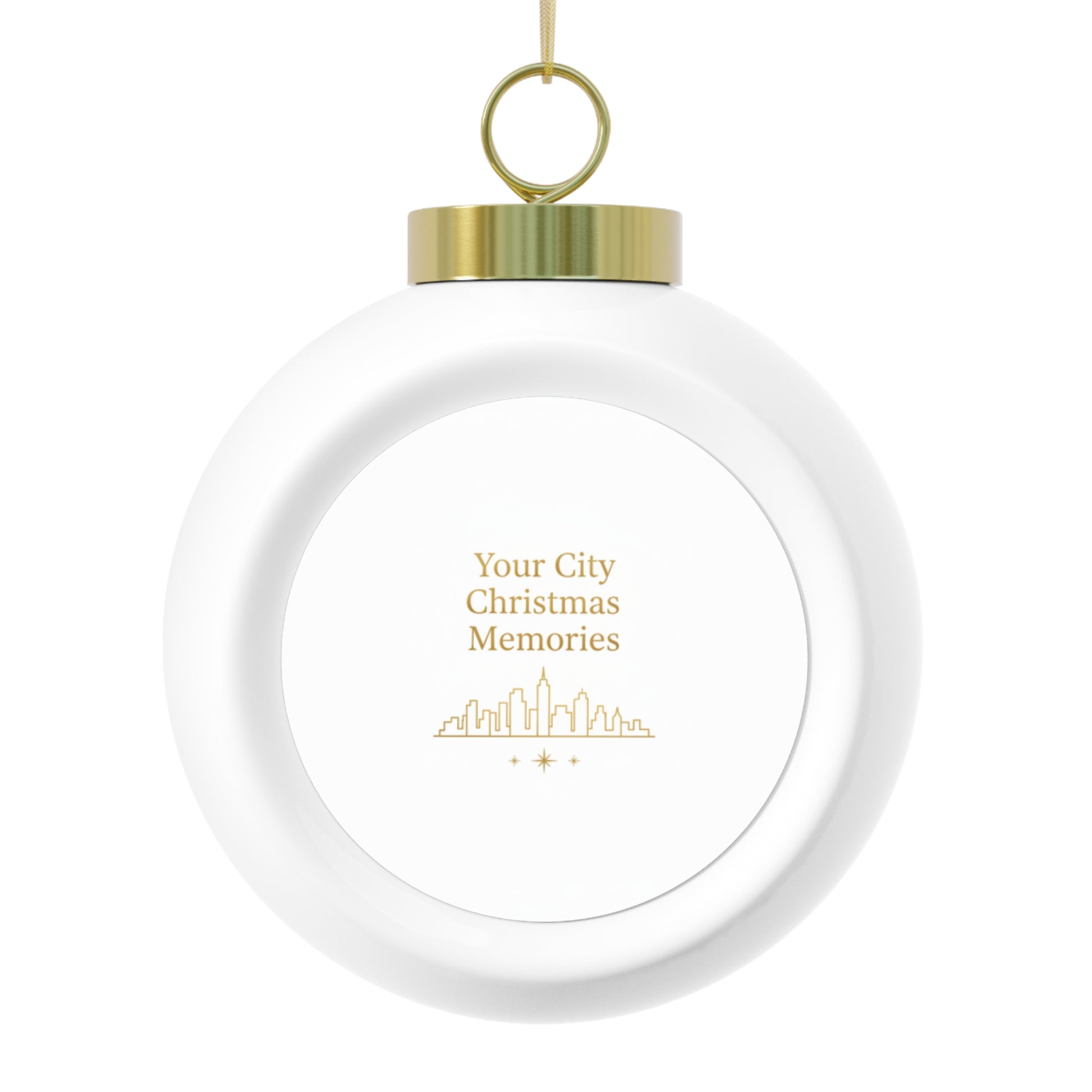 A glossy ceramic 3-inch ornament featuring the Your City Christmas Memories design to celebrate local holiday moments. It hangs from a gold ribbon and adds vintage-style charm to any tree. Perfect for gifting or adding a personalized touch to your holiday decor.