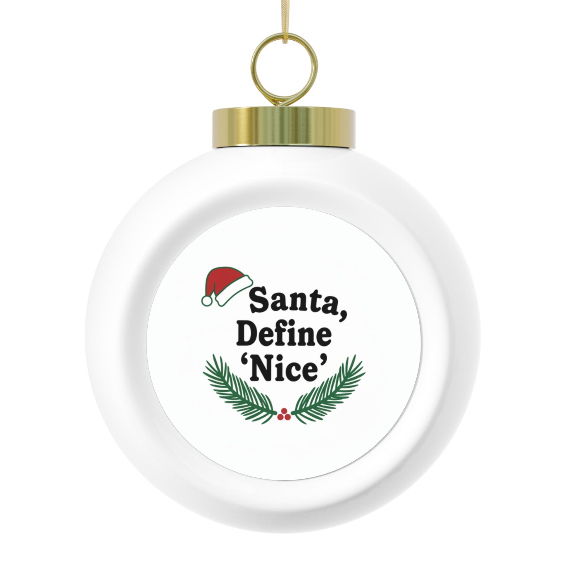 This glossy ceramic 3" Christmas ball ornament features the cheeky phrase Santa, Define Nice in bold festive typography. It comes with a gold ribbon for easy hanging and a vintage-style back decoration. A playful addition to your tree or a humorous gift for friends and family this holiday season.