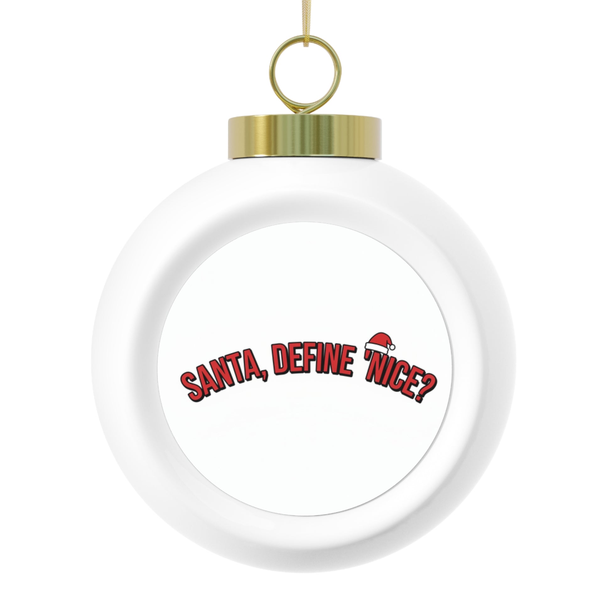 Cheeky vintage-style ceramic ornament that reads Santa, Define Nice. Glossy finish and gold ribbon make it ready to hang on any tree. A small 3-inch keepsake perfect as a humorous gift or stocking stuffer.