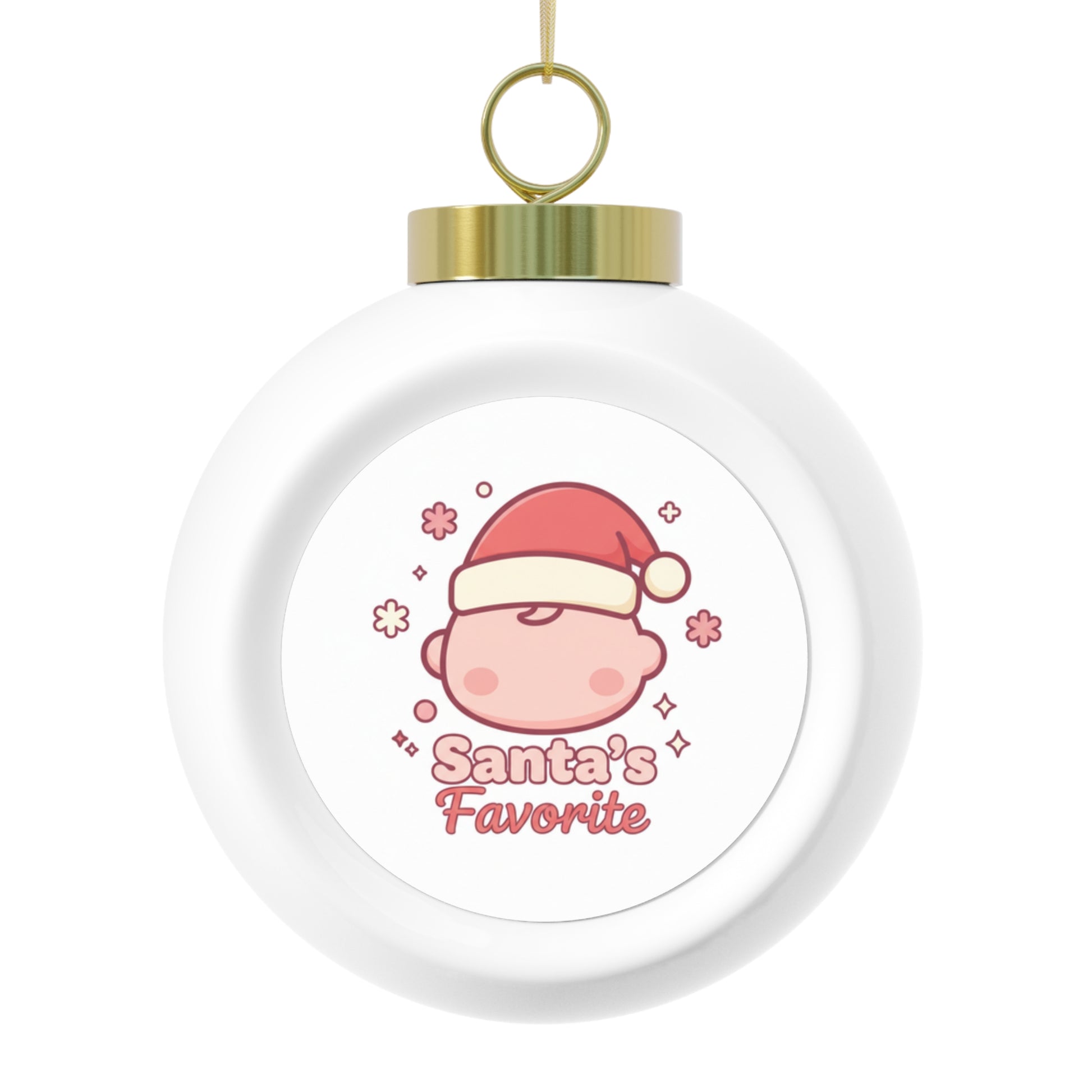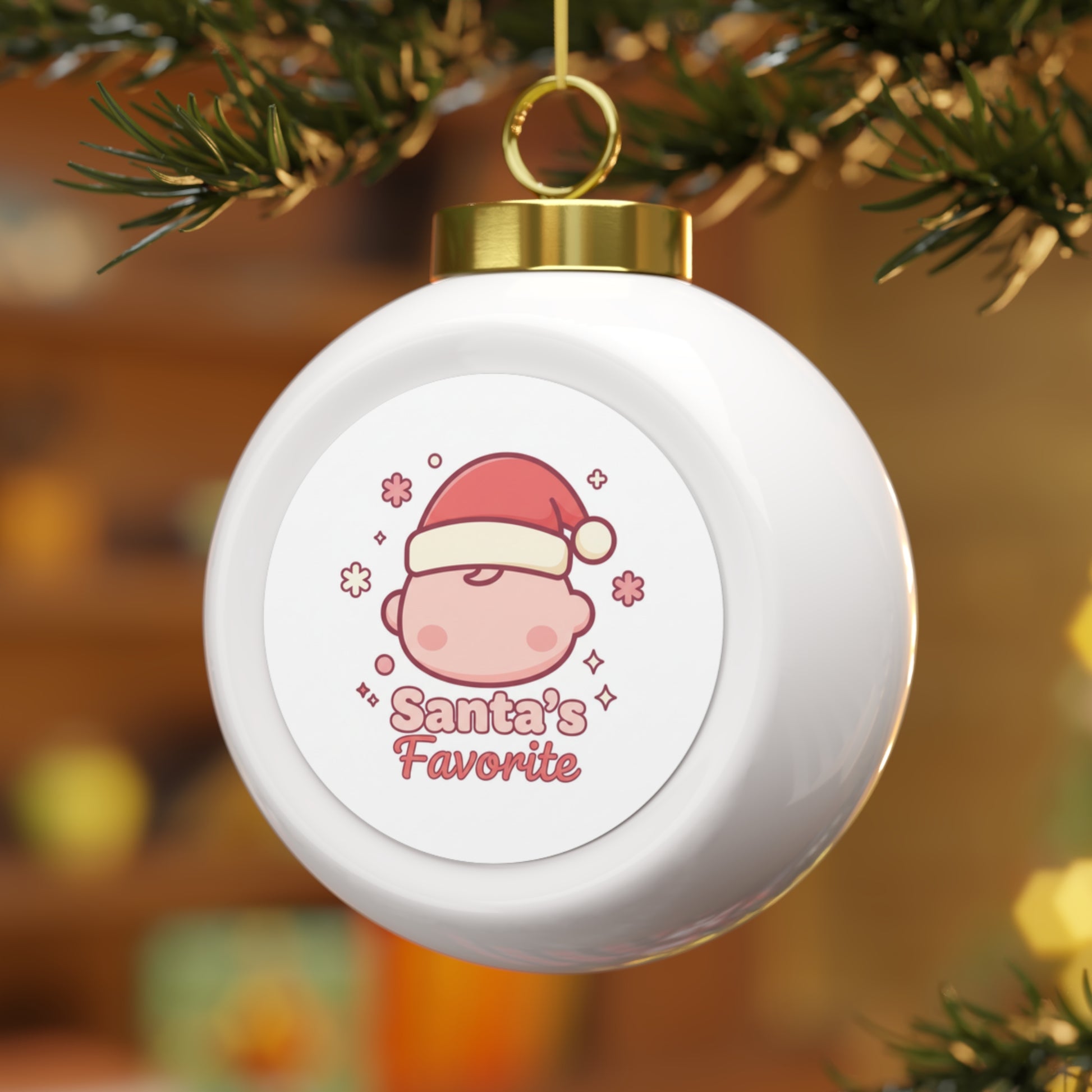 Glossy 3-inch ceramic Christmas ball ornament featuring the playful "Santa's Favorite" design on a durable aluminum insert. Comes ready to hang with a gold ribbon and a vintage-style back accent. A fun, cheeky addition to your holiday tree or a perfect small gift.